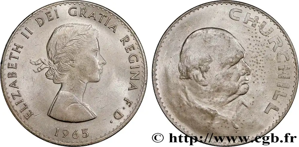 Type : 1 Crown Winston ChurchillDate : 1965Quantité frappée : 9640000Métal : cupro-nickelDiamètre : 38,61 mmAxe des coins : 12 h.Poids : 28,31 g.Tranche : striéeRéférence ouvrage :KM20/910 AversTitulature avers : ELIZABETH II DEI GRATIA REGINA D. F. / 1965.Description avers : Buste à droite lauré de la reine Élisabeth II.ReversTitulature revers : CHURCHILL.Description revers : portrait de trois quart à droite de Winston Churchill.HistoriqueROYAUME-UNI