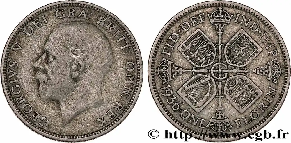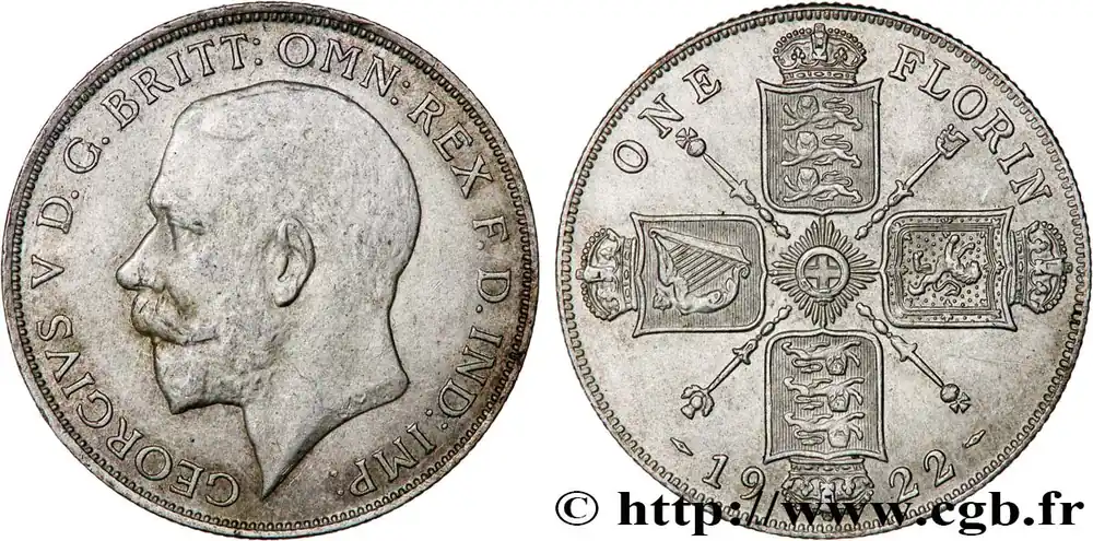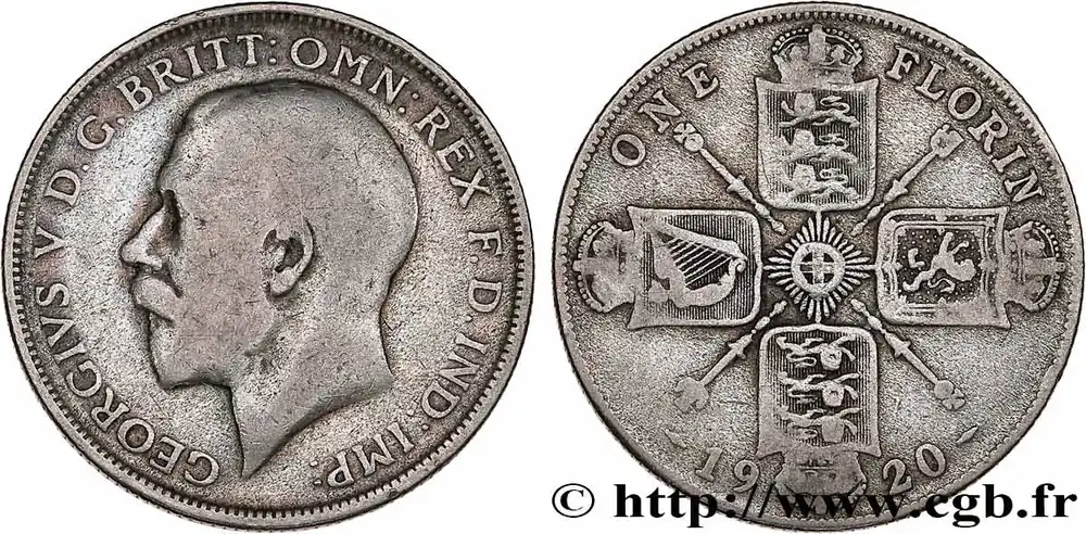 Type : 1 Florin Georges VDate : 1918Quantité frappée : 29212000Métal : argentTitre en millième : 925 ‰Diamètre : 28,3 mmAxe des coins : 12 h.Poids : 11,29 g.Tranche : canneléeRéférence ouvrage :KM20/817  – KM20/817 AversTitulature avers : GEORGIVS V D. G.BRITT: OMN: REX F. D. IND: IMP:.Description avers : portrait à gauche du roi Georges V.ReversTitulature revers : ONE FLORIN / (DATE).Description revers : quatre écus couronnés, quatre sceptes, au centre Ordre de la Jarretière.CommentaireA ne pas confondre avec le Florin en or du moyen age qui valait 6 shillings, le Florin en argent vaut 2 shillings ou un dixième de Livre or. En 1937, la dénomination “Florin” disparait au profit de l’inscription “2 Shillings”. En 1968, lors du passage au système décimal, le module devient une monnaie de 10 Pence..HistoriqueROYAUME-UNI