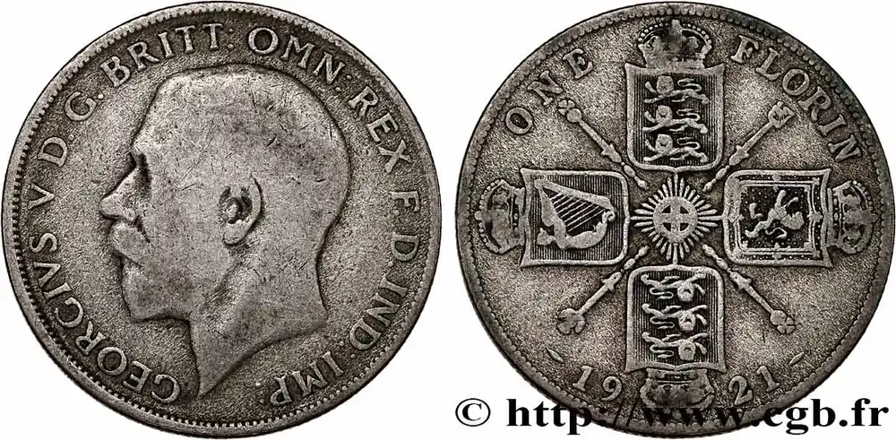 Type : 1 Florin Georges VDate : 1923Quantité frappée : 21546500Métal : argentTitre en millième : 500 ‰Diamètre : 28,5 mmAxe des coins : 12 h.Poids : 11,09 g.Tranche : canneléeRéférence ouvrage :Sp.4022A – KM20/817a AversTitulature avers : GEORGIVS V DEI GRA: BRITT. OMN: REX.Description avers : portrait à gauche du roi Georges V.ReversTitulature revers : FID.DEF-IND.IMP / (DATE).ONE-FLORIN.Description revers : quatre écus couronnés, quatre sceptes, au centre lettre “G”.HistoriqueROYAUME-UNI
