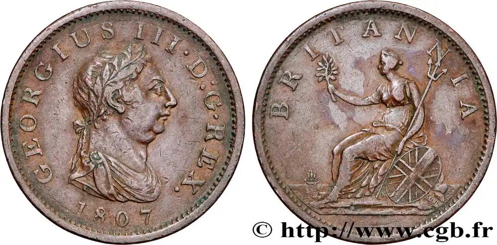 Type : 1 Penny Georges III tête lauréeDate : 1806Nom de l’atelier/ville : SohoQuantité frappée : -Métal : cuivreDiamètre : 34 mmAxe des coins : 6 h.Poids : 18,26 g.Tranche : tranche de sécuritéRéférence ouvrage :Sp.3780 – KM.19/663 AversTitulature avers : GEORGIUS III.D:G.REX / 1806.Description avers : portrait lauré à droite de Georges III.ReversTitulature revers : BRITANNIA.Description revers : Britannia assise.HistoriqueROYAUME-UNI