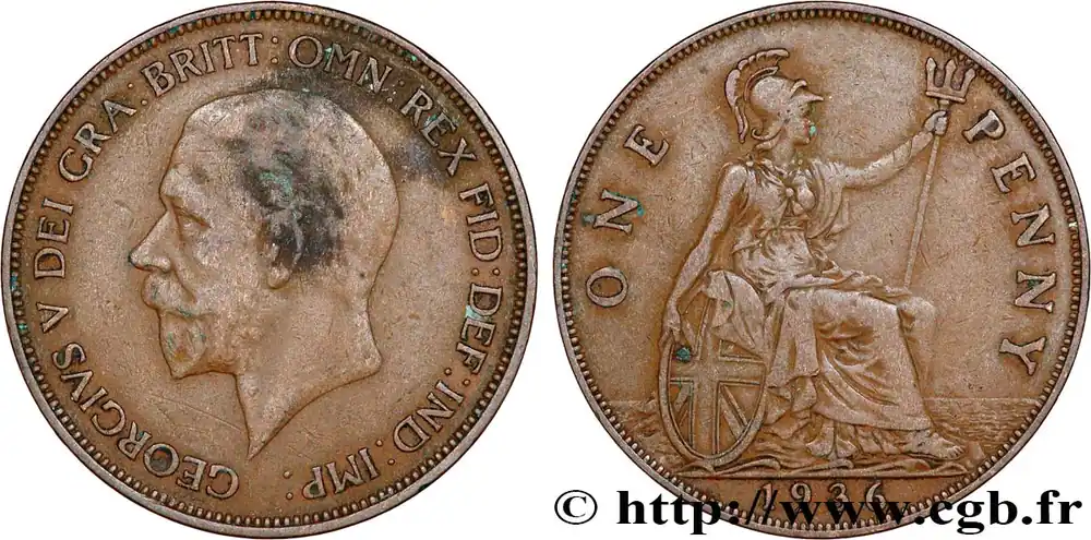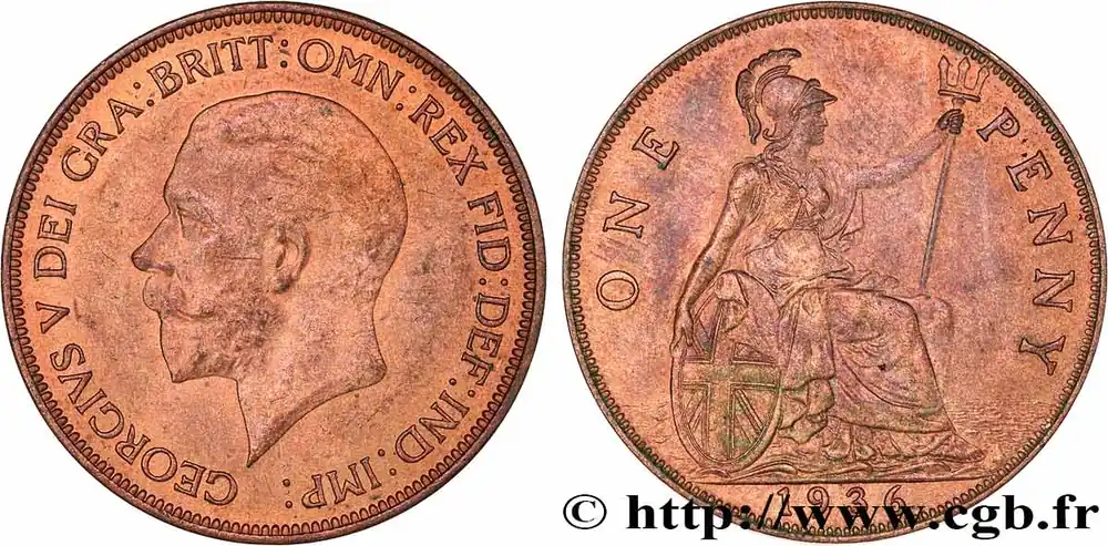 Type : 1 Penny Georges VDate : 1913Quantité frappée : 65497000Métal : bronzeDiamètre : 25 mmAxe des coins : 12 h.Poids : 9,69 g.Tranche : lisseRéférence ouvrage :Sp.4051 – KM20/810 AversTitulature avers : GEORGIVS V DEI GRA:BRITT:OMN:REX FID:DEF:IND:IMP.Description avers : Buste couronné à gauche de Georges V.Traduction avers : (Georges V Roi de toutes les Bretagnes par la grâce de Dieu Défenseur de la foi, Empereur des Indes).ReversTitulature revers : ONE PENNY/ 1913.Description revers : Britannia assise à droite.HistoriqueROYAUME-UNI