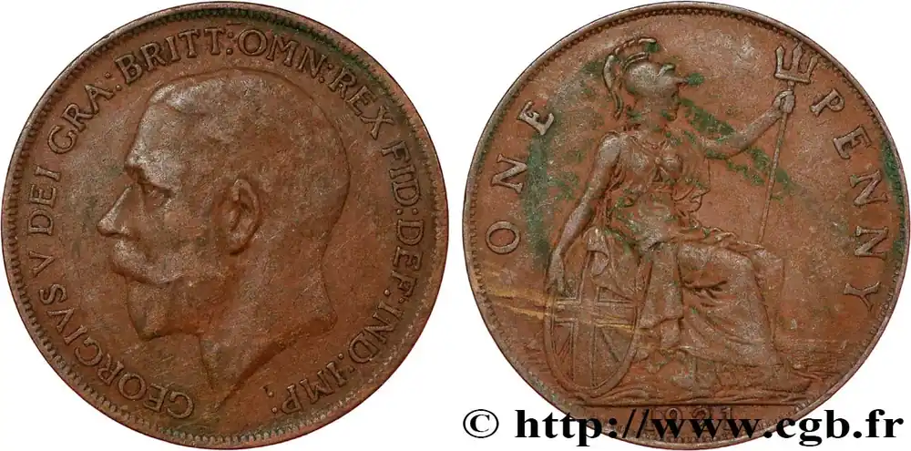 Type : 1 Penny Georges VDate : 1931Quantité frappée : 19843200Métal : bronzeDiamètre : 30,80 mmAxe des coins : 12 h.Poids : 9,44 g.Tranche : lisseRéférence ouvrage :Sp.4055  – KM20/838 AversTitulature avers : GEORGIVS V DEI GRA:BRITT:OMN:REX FID:DEF:IND:IMP.Description avers : portrai tà gauche du roi Georges V.ReversTitulature revers : ONE – PENNY // 1931.Description revers : Brittania assise face à droite.HistoriqueROYAUME-UNI