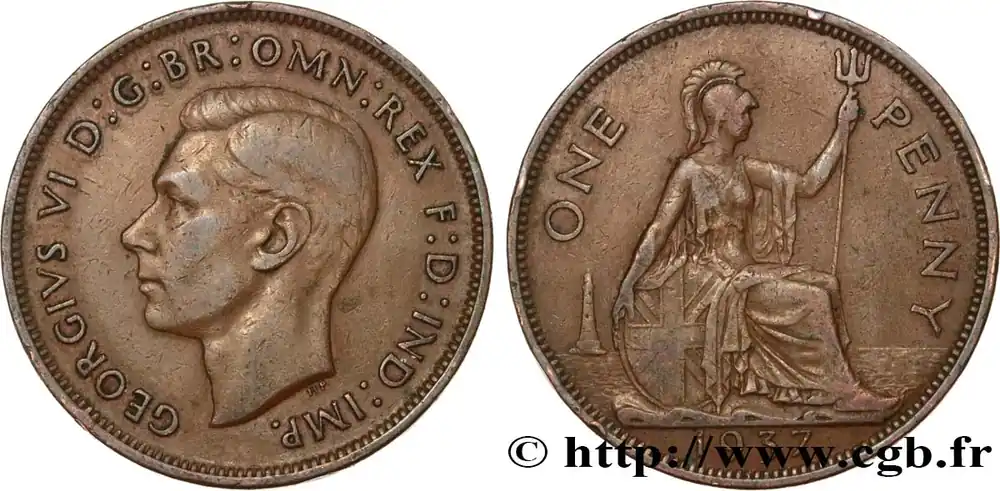 Type : 1 Penny Georges VIDate : 1937Quantité frappée : 88896000Métal : cuivreDiamètre : 31 mmAxe des coins : 12 h.Poids : 9,37 g.Tranche : lisseRéférence ouvrage :Sp.4114 – KM20/845 AversTitulature avers : GEORGIVS VI D:G:OMN:REX F: D: IND: IMP..Description avers : portrait à gauche du roi Georges VI.ReversTitulature revers : ONE – PENNY // 1937.Description revers : Britannia assise à droite.HistoriqueROYAUME-UNI