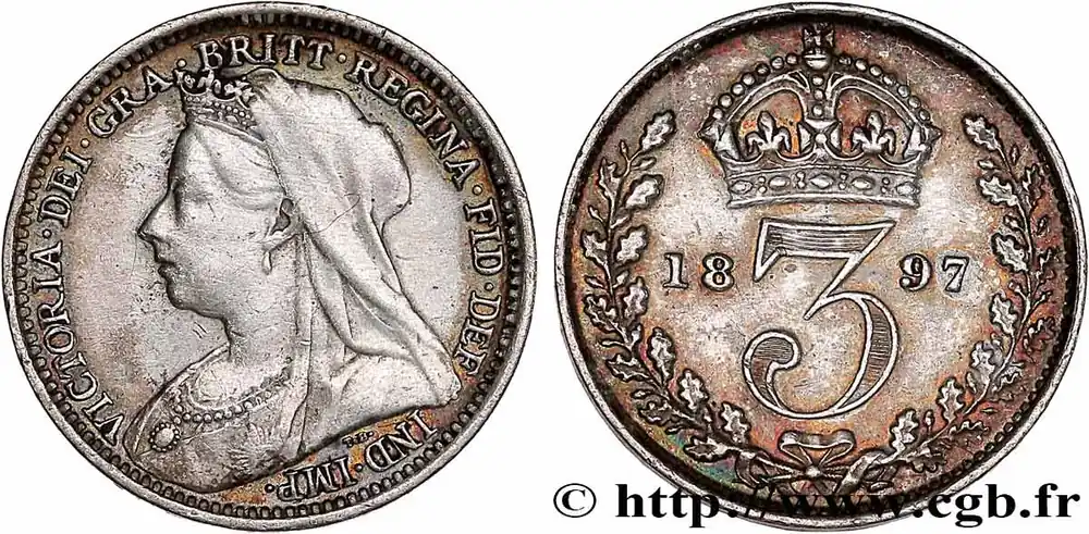 Type : 3 Pence Victoria buste du jubiléDate : 1897Quantité frappée : 4541294 Métal : argentTitre en millième : 925 ‰Diamètre : 16 mmAxe des coins : 12 h.Poids : 1,39 g.Tranche : lisseCommentaires sur l’état de conservation :Monnaie nettoyéeRéférence ouvrage :Sp.3945 – KM19/777 AversTitulature avers : VICTORIA DEI GRATIA BRITT: REGINA F:D:.Description avers : Buste couronné de Victoria à gauche.ReversTitulature revers : 1897.Description revers : 3 couronné.HistoriqueROYAUME-UNI