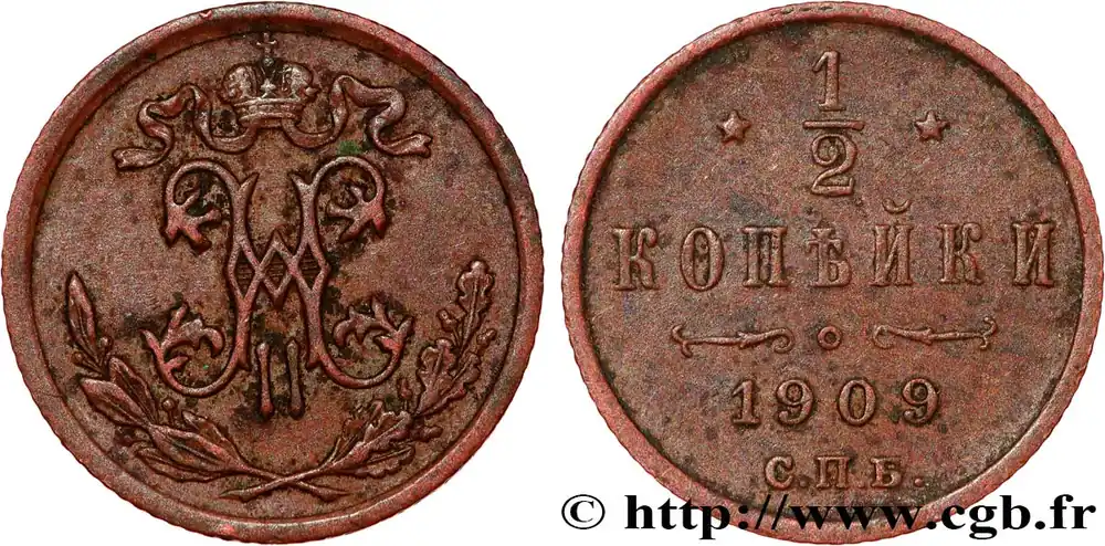 Type : 1/2 Kopeck Nicolas IIDate : 1909Nom de l’atelier/ville : Saint-PetersbourgQuantité frappée : 49500000Métal : cuivreDiamètre : 16 mmAxe des coins : 12 h.Poids : 1,72 g.Tranche : striéeRéférence ouvrage :KM20/48.1 AversDescription avers : monogramme couronné de Nicolas II.ReversTitulature revers : (LÉGENDE EN CYRILLIQUE) * 1/2 * / КОПѢЙКИ / 1909 / С. П. Б..Description revers : dans le champ.Traduction revers : (1/2 Kopeck 1909).HistoriqueRUSSIE
