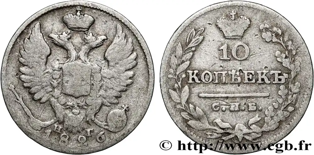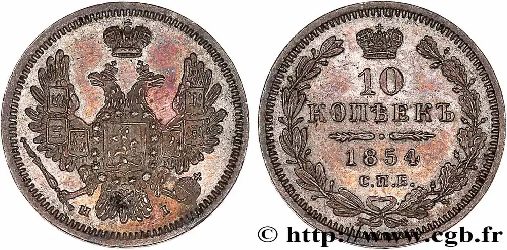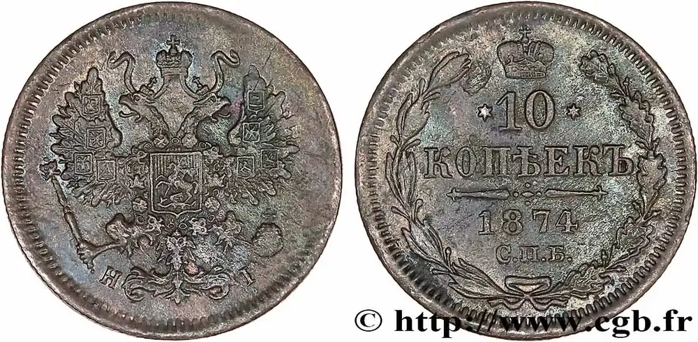 Type : 10 Kopecks aigle bicéphaleDate : 1904Nom de l’atelier/ville : Saint-PetersbourgQuantité frappée : 20000010Métal : argentTitre en millième : 500 ‰Diamètre : 17,2 mmAxe des coins : 12 h.Poids : 1,79 g.Tranche : striéeCommentaires sur l’état de conservation :Patine tachéeRéférence ouvrage :KM20/20a.2 AversTitulature avers : (LÉGENDE EN CYRILLIQUE) AP.Description avers : Aigle bicéphale héraldique couronné.ReversTitulature revers : (LÉGENDE EN CYRILLIQUE) *10* / КОПѢЕКЪ / 1904 / СПБ.Description revers : Légende cyrillique dans une couronne formée d’une branche d’olivier et d’une branche de chêne surmontée d’une petite couronne.HistoriqueRUSSIE