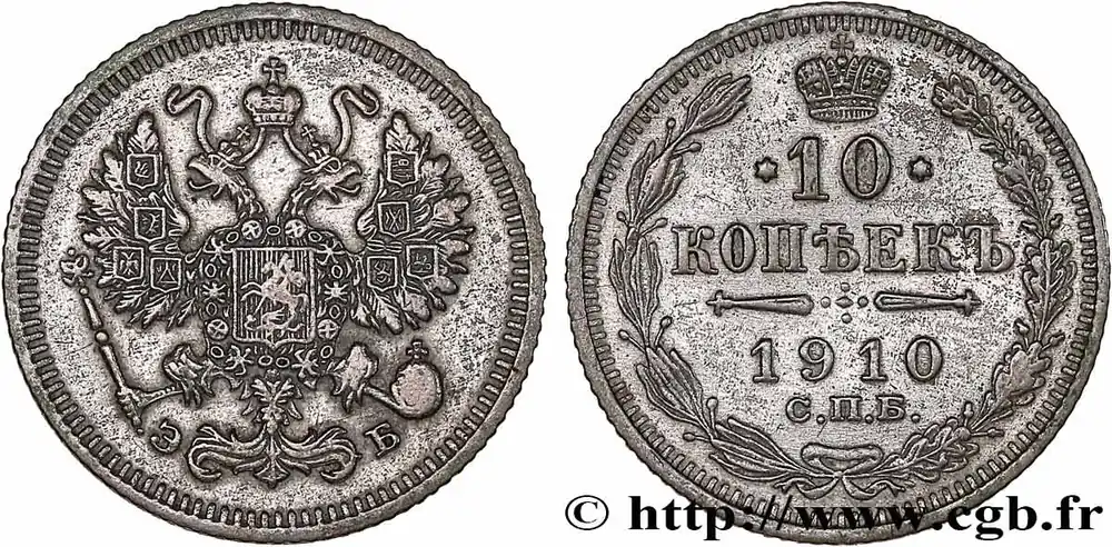 Type : 10 Kopecks aigle bicéphaleDate : 1911Nom de l’atelier/ville : Saint-PetersbourgQuantité frappée : 19467000Métal : argentTitre en millième : 500 ‰Diamètre : 17,2 mmAxe des coins : 12 h.Poids : 1,76 g.Tranche : striéeRéférence ouvrage :KM20/20a.2 AversTitulature avers : (LÉGENDE EN CYRILLIQUE) ЭБ.Description avers : Aigle bicéphale héraldique couronné.ReversTitulature revers : (LÉGENDE EN CYRILLIQUE) *10* / КОПѢЕКЪ / 1911 / С.П.Б..Description revers : Légende cyrillique dans une couronne formée d’une branche d’olivier et d’une branche de chêne surmontée d’une petite couronne.HistoriqueRUSSIE