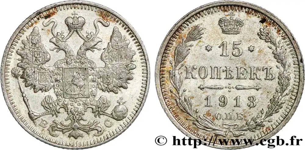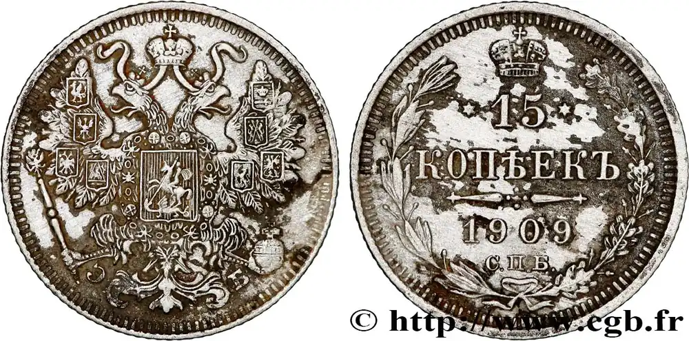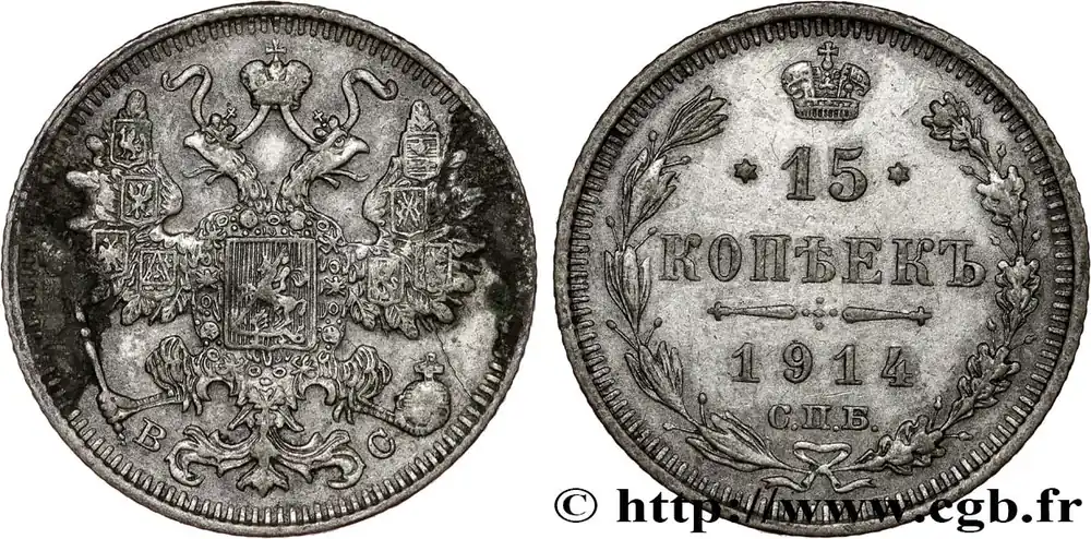 Type : 15 Kopecks aigle bicéphaleDate : 1890Nom de l’atelier/ville : Saint-PetersbourgQuantité frappée : 3500006Métal : argentTitre en millième : 500 ‰Diamètre : 20 mmAxe des coins : 12 h.Poids : 2,68 g.Tranche : striéeCommentaires sur l’état de conservation :Monnaie nettoyéeRéférence ouvrage :KM.19/21a.2 AversTitulature avers : (LÉGENDE EN CYRILLIQUE) АГ.Description avers : aigle bicéphale héraldique couronné.ReversTitulature revers : (LÉGENDE EN CYRILLIQUE) * 15 * / КОПѢЕКЪ / 1899 / С.П.Б..Description revers : au centre d’une couronne de chêne et de laurier.CommentaireInitiales du maître d’atelier Appolon Grasgov.HistoriqueRUSSIE