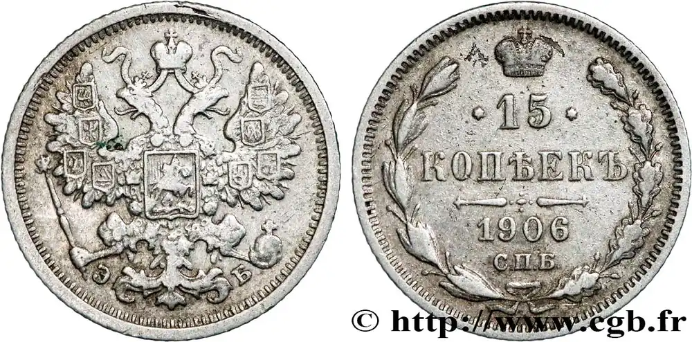 Type : 15 Kopecks aigle bicéphaleDate : 1914Nom de l’atelier/ville : Saint-PetersbourgQuantité frappée : 43367000Métal : argentTitre en millième : 750 ‰Diamètre : 20 mmAxe des coins : 12 h.Poids : 2,62 g.Tranche : striéeCommentaires sur l’état de conservation :Léger nettoyageRéférence ouvrage :KM20/21a.2 AversTitulature avers : B-C.Description avers : Aigle bicéphale héraldique couronné.ReversTitulature revers : (LÉGENDE CYRILLIQUE) * 15 * / КОПѢЕКЪ / 1914 / С.П.Б..Description revers : Légende cyrillique dans une couronne formée d’une branche d’olivier et d’une branche de chêne surmontée d’une petite couronne.Traduction revers : (15 Kopeks) 1914.HistoriqueRUSSIE