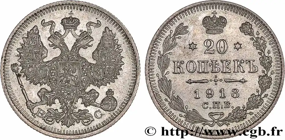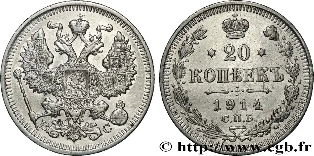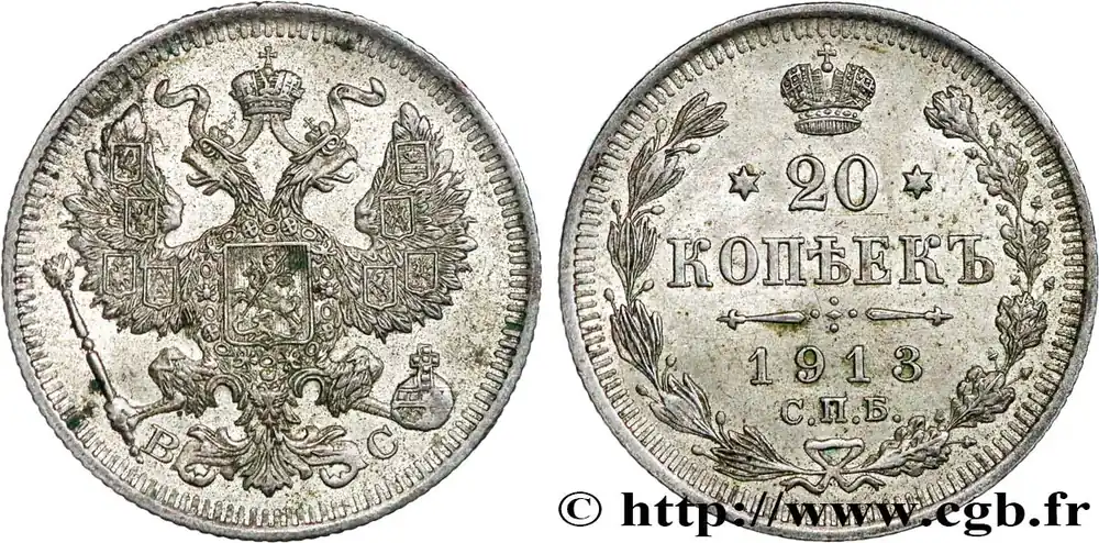 Type : 20 Kopecks aigle bicéphaleDate : 1878Nom de l’atelier/ville : Saint-PetersbourgQuantité frappée : 25335006Métal : argentTitre en millième : 500 ‰Diamètre : 22 mmAxe des coins : 12 h.Poids : 3,46 g.Tranche : canneléeCommentaires sur l’état de conservation :Patine tachéeRéférence ouvrage :KM.19/22a.1 AversTitulature avers : (LÉGENDE CYRILLIQUE) HI.Description avers : Aigle bicéphale héraldique couronné.ReversTitulature revers : (LÉGENDE CYRILLIQUE) 1872.Description revers : Légende dans une couronne ouverte.Traduction revers : (20 Kopecks).HistoriqueRUSSIE