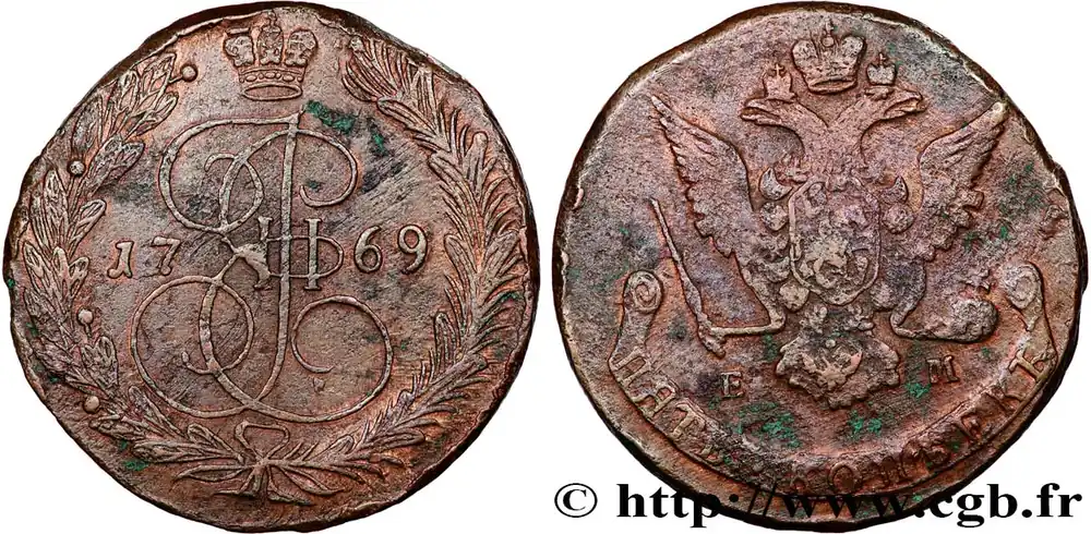 Type : 5 Kopecks Catherine IIDate : 1793Nom de l’atelier/ville : EkaterinbourgQuantité frappée : 22736000Métal : cuivreDiamètre : 44 mmAxe des coins : 12 h.Poids : 53,14 g.Tranche : macléeRéférence ouvrage :KM/WC.18/59.3 AversDescription avers : Monogramme de l’impératrice Catherine II, sous une couronne, dans une couronne végétale nouée en bas par un ruban ; de part et d’autre du monogramme la date.ReversTitulature revers : (LÉGENDE CYRILLIQUE).Description revers : Aigle bicéphale couronnée, sous une couronne, portant en cœur un évu ovale ; un sceptre et un globe crucigère dans les pattes ; au-dessous les lettres d’atelier.Traduction revers : (Cinq kopecks).HistoriqueRUSSIE