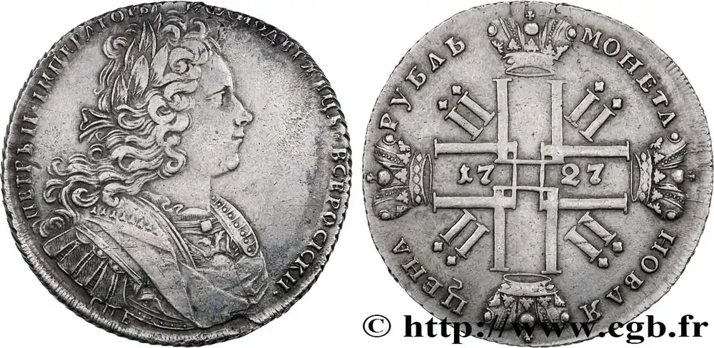 Type : RoubleDate : 1782Nom de l’atelier/ville : Saint-PétersbourgQuantité frappée : 1200000Métal : argentDiamètre : 36,5 mmAxe des coins : 12 h.Poids : 23,73 g.Tranche : striéeDegré de rareté : R1Commentaires sur l’état de conservation :Cette monnaie est frappée sur un flan large et régulier. Très légères traces de nettoyage. De fines rayures au droitRéférence ouvrage :KM/WC.18/67b p. 953 – Dav.1685  – Sév.2155  – Uzd.1180  – Mich.406, p. 237 (22/3)AversTitulature avers : LÉGENDE CYRILLIQUE.Description avers : Buste à droite de Catherine II. Dans les cheveux, la couronne impériale entourée d’une couronne de laurier.Traduction avers : (Par la grâce de Dieu, Catherine impératrice et autocrate de toute la Russie).ReversTitulature revers : LÉGENDE CYRILLIQUE.Description revers : Aigle bicéphale surmontée de trois couronnes impériales ; dans ses serres le globe et le sceptre ; sur sa poitrine l’écusson aux armes de Moscou (saint Georges à cheval, à droite). Autour de l’écu la grande chaîne de l’Ordre de Saint-André. De part et d’autre de la queue de l’aigle : N-3.Traduction revers : (Monnaie rouble, 1782).HistoriqueRUSSIE – CATHERINE II(17/07/1762-17/11/ 1796) Catherine (2/05/1729-17/11/1796) fut la plus grande tsarine après Pierre le Grand. Elle succéda à son mari, Pierre III, qui fut déposé en 1762 avant d’être assassiné par les frères Orloff. Son très long règne fit entrer la Russie dans le « Siècle des Lumières ». Amie des philosophes dont Diderot à qui elle acheta sa bibliothèque, libérale, elle renforça néanmoins le despotisme et l’étatisation de la Russie. Elle lutta contre les Turcs et se montra une adversaire de la Révolution Française.