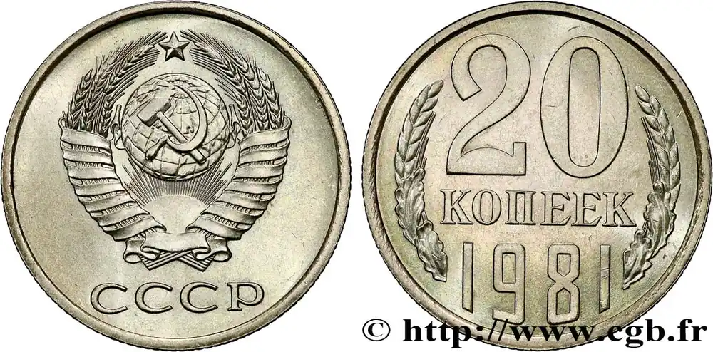 Type : 20 Kopecks URSSDate : 1961Quantité frappée : -Métal : cupro-nickel-zincDiamètre : 21,80 mmAxe des coins : 12 h.Poids : 3,30 g.Tranche : striéeRéférence ouvrage :KM20/132 AversTitulature avers : (LÉGENDE EN CYRILLIQUE) СССР.Description avers : Emblème de l’URSS.Traduction avers : (URSS).ReversTitulature revers : (LÉGENDE EN CYRILLIQUE) 20 / КОПЕЕК / 1961.Description revers : Dans le champ entre deux rameaux.HistoriqueRUSSIE – URSS(1922-1991) La Révolution de Février 1917 met fin au régime des tsars de Russie. La République Russe est renversée par les bolcheviks en Octobre 1917. Le 30 décembre 1922, est signé le traité relatif à la formation de l’Union des Républiques Socialistes Soviétiques (URSS). Bien que disposant d’un chef de l’état et d’un chef du gouvernement, l’URSS est en fait dirigé par le chef du Parti communiste de l’Union soviétique, seul parti autorisé entre 1925 et 1990.Le 8 décembre 1991, les présidents de Russie, d’Ukraine et de Biélorussie signent les Accord de Minsk qui proclame la dissolution de l’URSS par ses États fondateurs.