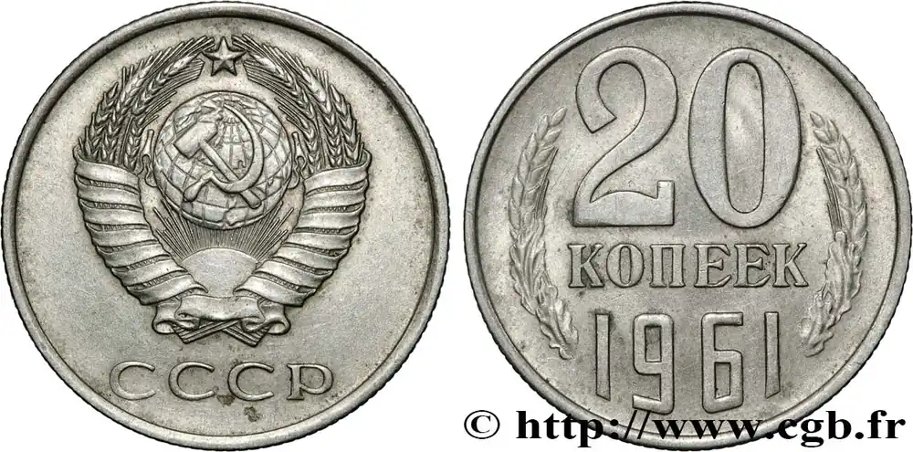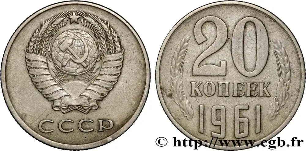 Type : 20 Kopecks URSSDate : 1988Quantité frappée : -Métal : cupro-nickel-zincDiamètre : 21,80 mmAxe des coins : 12 h.Poids : 3,35 g.Tranche : striéeRéférence ouvrage :KM20/132 AversTitulature avers : (LÉGENDE EN CYRILLIQUE) CCCP.Description avers : Emblème de l’URSS.Traduction avers : (URSS).ReversTitulature revers : (LÉGENDE EN CYRILLIQUE) 20 / КОПЕЕК / 1988.Description revers : Dans le champ entre les épis de blé et des feuilles de chêne.Traduction revers : (20/ Kopecks / 1988).HistoriqueRUSSIE – URSS(1922-1991) La Révolution de Février 1917 met fin au régime des tsars de Russie. La République Russe est renversée par les bolcheviks en Octobre 1917. Le 30 décembre 1922, est signé le traité relatif à la formation de l’Union des Républiques Socialistes Soviétiques (URSS). Bien que disposant d’un chef de l’état et d’un chef du gouvernement, l’URSS est en fait dirigé par le chef du Parti communiste de l’Union soviétique, seul parti autorisé entre 1925 et 1990.Le 8 décembre 1991, les présidents de Russie, d’Ukraine et de Biélorussie signent les Accord de Minsk qui proclame la dissolution de l’URSS par ses États fondateurs.