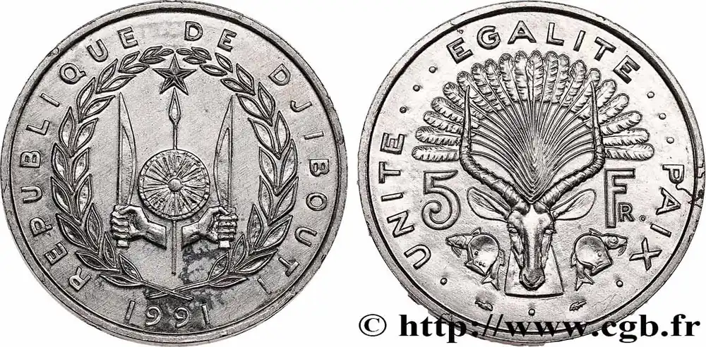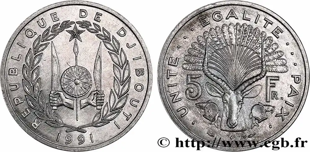 Type : 5 FrancsDate : 1991Nom de l’atelier/ville : ParisQuantité frappée : 2000000Métal : aluminiumDiamètre : 31,1 mmAxe des coins : 6 h.Poids : 3,75 g.Tranche : lisseRéférence ouvrage :KM20/21 AversTitulature avers : REPUBLIQUE DE DJIBOUTI // 1991.Description avers : emblème de la République de Djibouti.ReversTitulature revers : · UNITE ···EGALITE ··· PAIX · // 5 FR..Description revers : Tête d’antilope de face, un arbre du voyageur derrière, encadrée de poissons.HistoriqueDJIBOUTI(1977-) La République de Djibouti correspond à l’ancien territoire colonial français constitué autour du golfe de Tadjourah dans la corne de l’Afrique. Le territoire d’Obock et dépendances est constitué par la France en 1862. En 1896, le territoire est rebaptisé Côte française des Somalis puis en 1967 Territoire français des Afars et des Issas. En 1977, l’indépendance est proclamée.