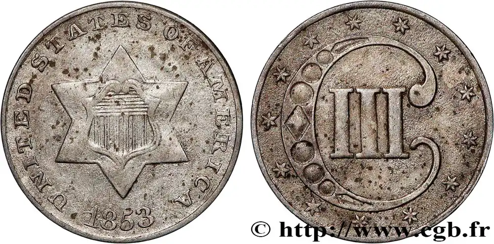 Type : 3 CentsDate : 1851Nom de l’atelier/ville : Nouvelle-Orléans – OQuantité frappée : 720000Métal : argentTitre en millième : 750 ‰Diamètre : 14 mmAxe des coins : 6 h.Poids : 0,80 g.SlabNGC : AU53Commentaires sur l’état de conservation :monnaie sous coque NGC AU 53Référence ouvrage :KM19/75 – Y.- AversTitulature avers : UNITED STATES OF AMERICA 1851.Description avers : Écusson américain sur une étoile à 6 branches.ReversDescription revers : III dans un C, autour 13 étoiles.HistoriqueÉTATS-UNIS D’AMÉRIQUE