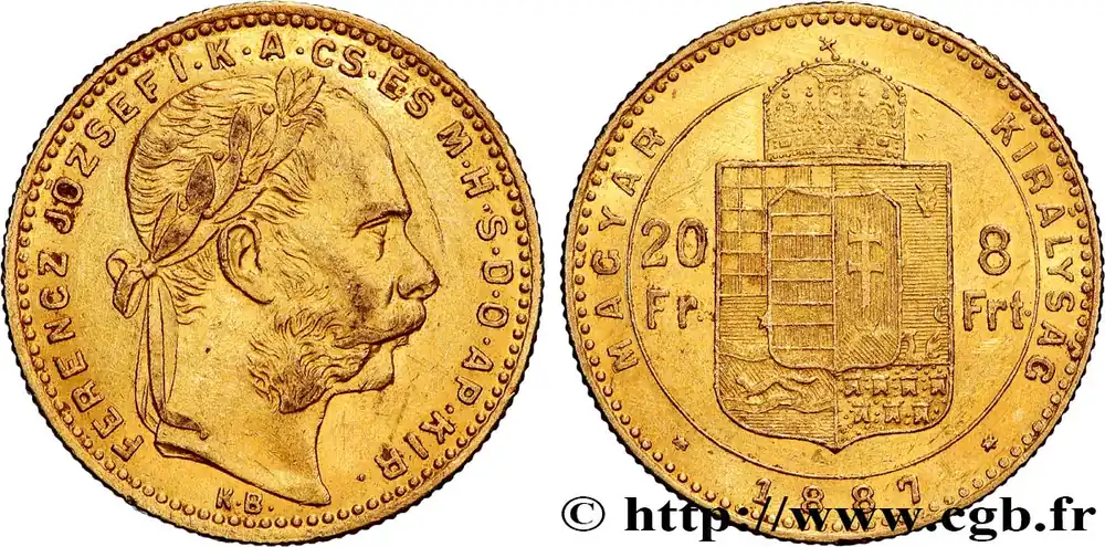 Type : 20 Francs or ou 8 Forint François-Joseph IerDate : 1883Nom de l’atelier/ville : KremnitzQuantité frappée : 300429Métal : orTitre en millième : 900 ‰Diamètre : 21 mmAxe des coins : 12 h.Poids : 6,46 g.Tranche : canneléeCommentaires sur l’état de conservation :Monnaie nettoyéeRéférence ouvrage :KM.19/467 AversTitulature avers : FERENCZ JOZSEF I. K. A. CS. ES. M. H. S. D. O. AP. KIR..Description avers : Tête laurée de François-Joseph Ier à droite ; KB sous la tête.ReversTitulature revers : MAGYAR – KIRALYSAG/ 1883.Description revers : Écu couronné surmonté de la couronne de saint André ; dans le champ 20/ Fr – 8/ Frt.Traduction revers : (Royaume de Hongrie).CommentaireCe type a seulement été fabriqué de 1880 à 1890. Ces pièces furent démonétisées par la loi du 9 août 1892, mais continuèrent néanmoins de circuler dans les pays de l’Union Latine. Cette pratique d’une double valeur faciale sur la même pièce avait pour but de montrer aux populations que la devise nationale était toujours présente tout en permettant l’utilisation d’un étalon commun avec d’autres pays.HistoriqueOR, PALLADIUM ET PLATINE INVESTISSEMENTSécurisez et diversifiez votre épargne avec les métaux précieux :Dans un contexte d’instabilité politique et économique croissante, diversifier son épargne peut être une démarche judicieuse. Les métaux précieux comme l’or, le palladium et le platine constituent des actifs tangibles souvent prisés en raison de leur caractère intemporel et de leur résilience face aux fluctuations des marchés.Pour répondre à des besoins variés, l’achat de pièces officielles en or, palladium ou platine est une option flexible et adaptée. Ces pièces, disponibles à l’unité ou en lot, permettent à chacun d’ajuster ses choix selon ses objectifs et son budget, sans engagement à long terme.Un processus simple et sécurisé :Nous proposons une livraison sécurisée et garantie. Les paiements peuvent être effectués par carte bancaire ou par virement, bien que certaines transactions puissent nécessiter un règlement exclusivement par virement bancaire. Une pièce d’identité valide (carte nationale d’identité ou passeport) sera demandée pour finaliser votre achat.Stockage en toute sécurité et confidentialité :Le département Investissement de CGB Numismatique Paris met à votre disposition des solutions de stockage offrant une sécurité renforcée et une confidentialité optimale pour vos achats en or, palladium et platine.Contactez-nous pour plus d’informations :Pour toute question ou pour passer commande, prenez contact avec notre responsable des achats/ventes de métaux précieux : par email à [email protected] ou par téléphone. Nous mettons à votre disposition des informations générales et des services pour vous accompagner dans vos projets d’investissement.CGB Numismatique Paris agit en tant que fournisseur de métaux précieux et ne fournit aucun conseil en investissement. La valeur des métaux précieux peut fluctuer, et les performances passées ne garantissent pas les résultats futurs. L’achat de métaux précieux doit être considéré comme une stratégie de préservation de valeur plutôt qu’un investissement spéculatif. Conformément à l’article L.221-28 du Code de la consommation, le droit de rétractation ne s’applique pas aux achats d’or d’investissement, dont le prix dépend des fluctuations des marchés financiers.