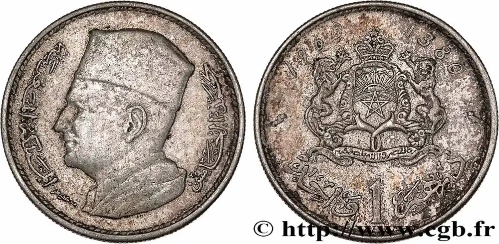 Type : 1 Dirham Mohammed V AH 1380Date : 1960Nom de l’atelier/ville : ParisQuantité frappée : 33000000Métal : argentTitre en millième : 600 ‰Diamètre : 24 mmAxe des coins : 6 h.Poids : 6 g.Tranche : canneléeRéférence ouvrage :KM20/55 AversTitulature avers : (LÉGENDE EN ARABE).Description avers : buste à gauche du roi Mohammed V.ReversTitulature revers : 1960 – 1380 (LÉGENDE EN ARABE).Description revers : armes du Royaume du Maroc.HistoriqueMAROC