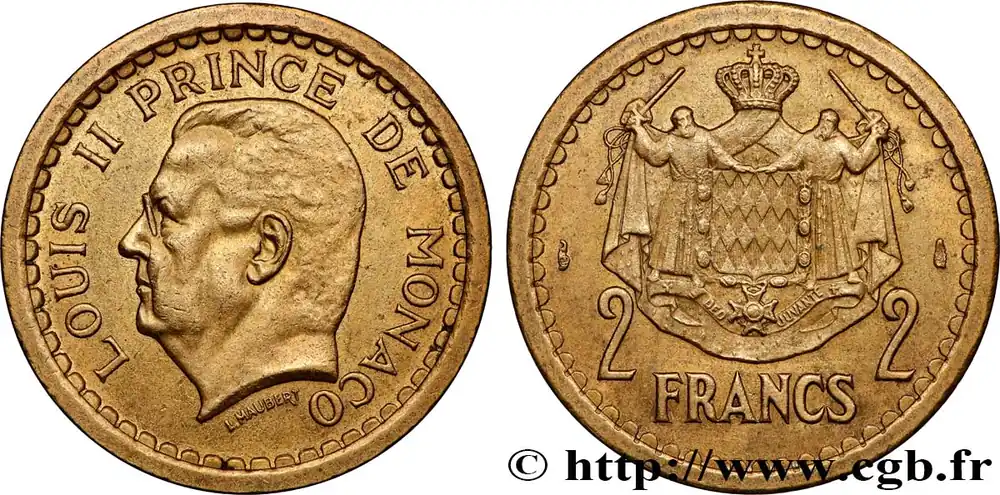 Type : 2 Francs Louis IIDate : (1943)Nom de l’atelier/ville : ParisQuantité frappée : 1250000Métal : aluminiumDiamètre : 27 mmAxe des coins : 6 h.Poids : 2,24 g.Tranche : lisseRéférence ouvrage :G.2019.133 – KM20/121 AversTitulature avers : LOUIS II PRINCE DE MONACO.Description avers : Tête à gauche de Louis II ; signé L. MAUBERT.ReversTitulature revers : 2 – 2/ FRANCS.Description revers : Écu aux armes des Grimaldi soutenu par deux moines posé sur un manteau couronné.CommentaireMonnaie non datée ; l’aluminium n’a été frappé qu’en 1943.HistoriqueMONACO
