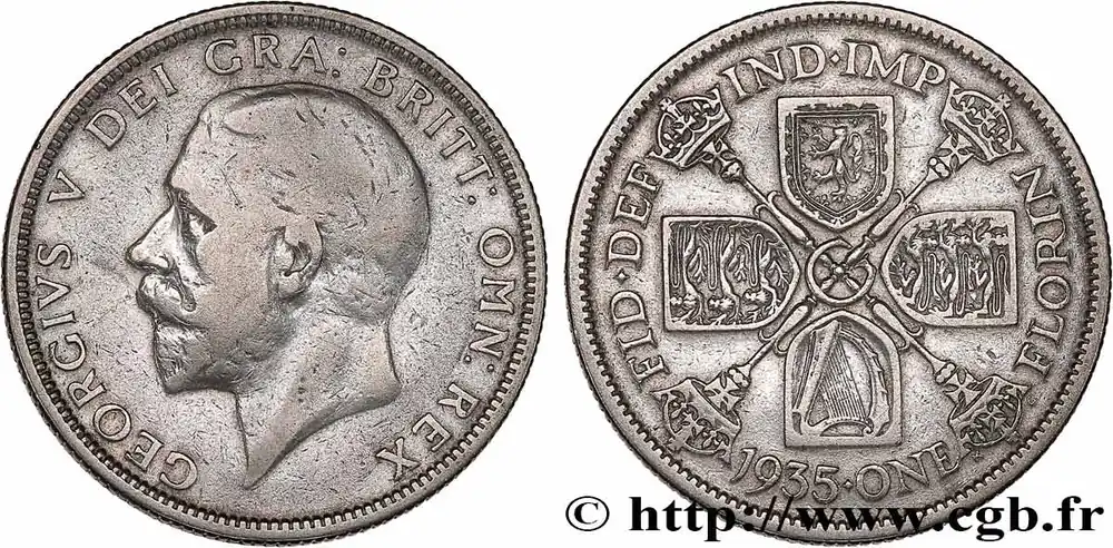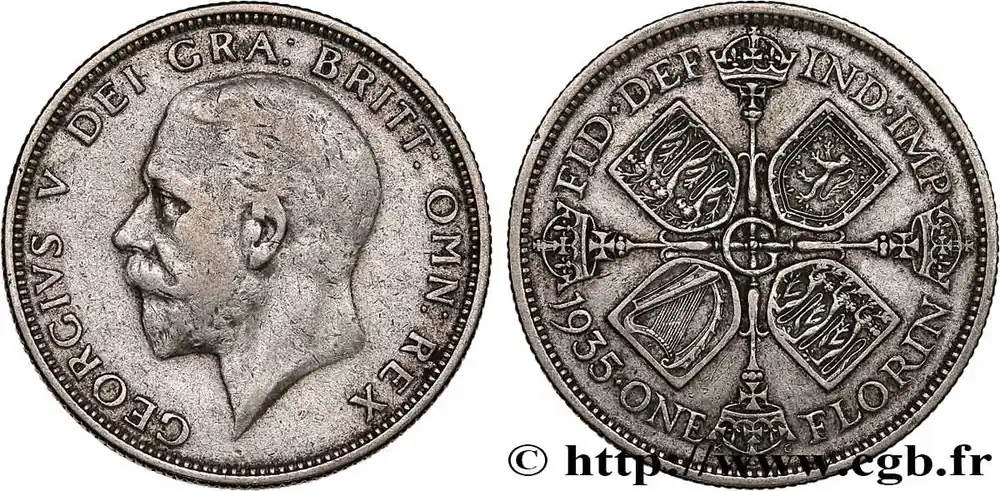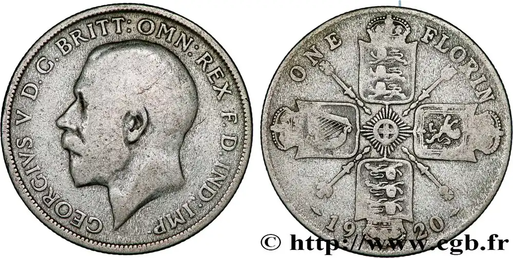 Type : 1 Florin Georges VDate : 1924Quantité frappée : 4582000Métal : argentDiamètre : 28,3 mmAxe des coins : 12 h.Poids : 11,34 g.Tranche : canneléeRéférence ouvrage :KM20/817a AversTitulature avers : GEORGIVS V D. G.BRITT: OMN: REX F. D. IND: IMP:.Description avers : portrait à gauche du roi Georges V.ReversTitulature revers : ONE FLORIN / (DATE).Description revers : quatre écus couronnés, quatre sceptes, au centre Ordre de la Jarretière.CommentaireA ne pas confondre avec le Florin en or du moyen age qui valait 6 shillings, le Florin en argent vaut 2 shillings ou un dixième de Livre or. En 1937, la dénomination “Florin” disparait au profit de l’inscription “2 Shillings”. En 1968, lors du passage au système décimal, le module devient une monnaie de 10 Pence..HistoriqueROYAUME-UNI