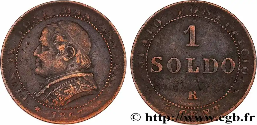 Type : 1 Soldo an XXI buste largeDate : 1867Nom de l’atelier/ville : RomeQuantité frappée : 8544000Métal : cuivreDiamètre : 25,5 mmAxe des coins : 6 h.Poids : 5,00 g.Tranche : lisseRéférence ouvrage :Mont.409 – KM19/1372 AversTitulature avers : PIVS IX. PONT. MAX. ANN. XXI*1867*.Description avers : Petit buste à gauche de Pie IX.Traduction avers : (Pie IX souverain pontife, vingt-et-unième année).ReversTitulature revers : STATO PONTIFICIO * 5. CENT*.Description revers : 1 SOLDO / R.HistoriqueVATICAN ET ÉTATS PONTIFICAUX
