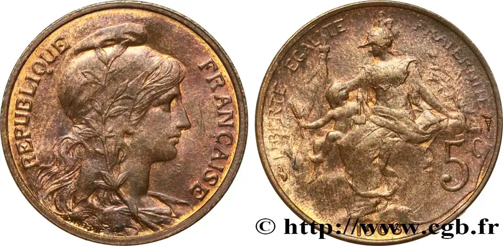 Type : 5 centimes Daniel-DupuisDate : 1901Quantité frappée : 6000000Métal : bronzeDiamètre : 25 mmAxe des coins : 6 h.Poids : 4,94 g.Tranche : lisse Commentaires sur l’état de conservation :Exemplaire nettoyé/brosséRéférence ouvrage :Classement FRANC 2023 / FRANC 2023 classificationF.119/11AversTitulature avers : REPUBLIQUE – FRANCAISE.Description avers : Buste de la Liberté à droite, coiffée du bonnet phrygien orné d’une couronne ; signé au-dessous en creux DANIEL DUPUIS.ReversTitulature revers : LIBERTE EGALITE – FRATERNITE// 5 C DANS UN CARTOUCHE// DANIEL DUPUIS EN CREUX ET LE MILLÉSIME.Description revers : La République cuirassée et drapée, assise à gauche sur un rocher tenant de sa main droite un drapeau-étendard et de sa main gauche une branche d’olivier ; à sa droite un enfant tenant des épis de blé et un marteau.HistoriqueTROISIÈME RÉPUBLIQUE(4/09/1870-10/07/1940) La nouvelle de la capitulation de Sedan provoque la révolution du 4 septembre 1870 à Paris. Proclamée à l’Hôtel de Ville, la République est dotée d’un gouvernement provisoire appelé gouvernement de la Défense nationale. Menacé à gauche par l’insurrection de la Commune et à droite par les monarchistes, le nouveau régime connaît des débuts difficiles. Chef du pouvoir exécutif dans un premier temps (février 1871), Thiers est chargé de réorganiser le pays avant de choisir sa forme de gouvernement. Il devient président de la République en août 1871 et, malgré son action de libération du territoire, doit quitter son poste en mars 1873 face à l’opposition royaliste. Il est alors remplacé par Mac-Mahon favorable au rétablissement de la monarchie mais celle-ci n’est pas restaurée à la suite de la question du drapeau. La loi du septennat est alors mise en place en novembre 1873 puis, en 1875, sont votées les lois fondamentales qui servent de Constitution à la Troisième République. Régime parlementaire, elle se caractérise notamment par la nette prépondérance du pouvoir législatif sur le pouvoir exécutif. Anticléricale, la Troisième République rend l’école gratuite, laïque et obligatoire mais continue la politique coloniale pour ses ambitions économiques, stratégiques et morales. La séparation des Églises et de l’État est votée en 1905. L’idée d’une revanche sur l’Allemagne et un nationalisme important sont au cœur de la crise boulangiste, du scandale de Panama ou de l’affaire Dreyfus des années 1886-1899 tandis que la politique étrangère est très active notamment au Maroc et que la course aux armements se développe. La Première Guerre mondiale coûte cher à la France qui ne se relève qu’à partir de 1920 voire 1928 pour la monnaie avec le franc « Poincaré ». La crise de 1929 ne se fait sentir qu’à partir de 1932 mais dure jusqu’en 1939, période durant laquelle l’instabilité ministérielle est très importante. Vacillant en 1934, la Troisième République trouve un nouveau ciment unitaire avec l’antifascisme qui permet l’arrivée au pouvoir du Front populaire en 1936. Mais, paralysée face à l’Allemagne, la France va alors s’enliser dans une « drôle de guerre » puis connaître l’une des plus grandes défaites de son histoire en juin 1940. Réunies en Assemblée nationale à Vichy le 10 juillet 1940, les Chambres, pourtant élues en 1936, votent les pleins pouvoirs à Pétain dans une sorte de suicide collectif par 569 voix pour, 80 voix contre et 18 abstentions.