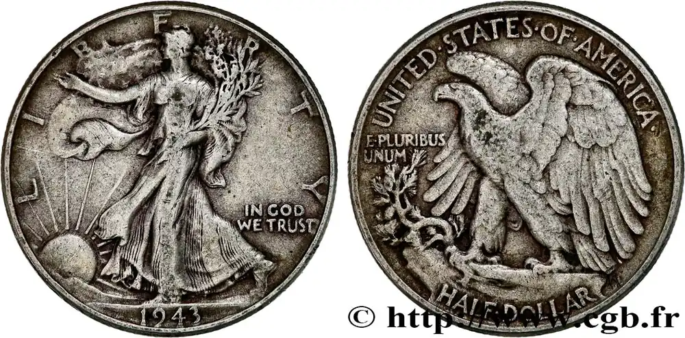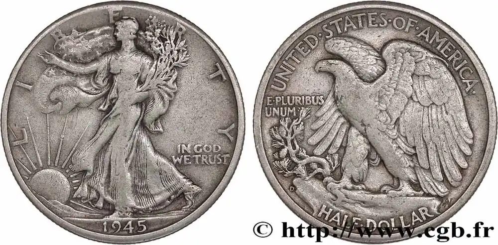 Type : 1/2 Dollar Walking LibertyDate : 1945Nom de l’atelier/ville : PhiladelphieQuantité frappée : 31502000Métal : argentTitre en millième : 900 ‰Diamètre : 30,6 mmPoids : 12,42 g.Tranche : canneléeRéférence ouvrage :KM20/142 – Y.- AversTitulature avers : LIBERTY // (DATE).Description avers : Liberté marchant à gauche, soleil levant ; IN GOD / WE TRUST dans le champ.Traduction avers : (Liberté).ReversTitulature revers : UNITED STATES OF AMERICA // HALF DOLLAR.Description revers : aigle aux ailes déployées ; E.PLURIBUS / UNUM dans le champ à gauche.Traduction revers : (États-Unis d’Amérique // demi-dollar).HistoriqueÉTATS-UNIS D’AMÉRIQUE