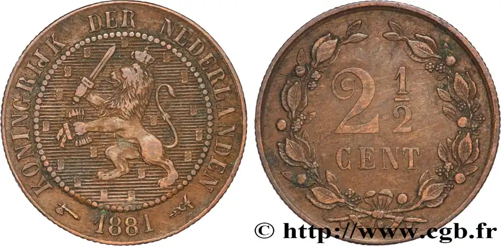 Type : 2 1/2 Cents lion couronnéDate : 1894Nom de l’atelier/ville : UtrechtQuantité frappée : 1000000Métal : bronzeDiamètre : 23,5 mmAxe des coins : 6 h.Poids : 4,02 g.Tranche : canneléeRéférence ouvrage :KM.19/108 AversTitulature avers : KONINGRIJK DER NEDERLANDEN // 1894.Description avers : lion héraldique des Pays-Bas.ReversTitulature revers : 2 1/2 CENT.Description revers : dans une couronne végétale composite.HistoriquePAYS-BAS