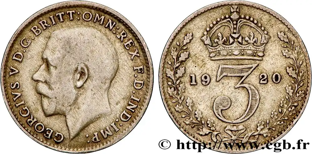 Type : 3 Pence Georges VDate : 1920Quantité frappée : 16704000Métal : argentTitre en millième : 500 ‰Diamètre : 16 mmAxe des coins : 12 h.Poids : 1,38 g.Tranche : lisseRéférence ouvrage :Sp.4026  – KM20/813a AversTitulature avers : GEORGIVS V D.G. BRITT:OMN:REX F.D.IND:IMP: // B.M..Description avers : portrait à gauche de Georges V.ReversTitulature revers : 19 – 3 – 20.Description revers : entre deux rameaux, couronne.HistoriqueROYAUME-UNI