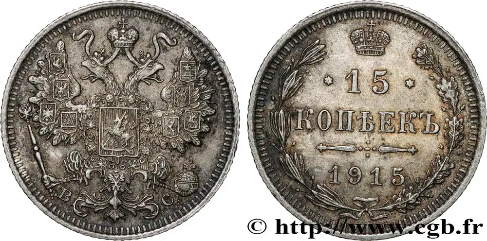 Type : 15 KopecksDate : 1912Nom de l’atelier/ville : Saint-PetersbourgQuantité frappée : 29000000Métal : argentTitre en millième : 750 ‰Diamètre : 20 mmAxe des coins : 12 h.Poids : 2,68 g.Tranche : striéeCommentaires sur l’état de conservation :patine sombreRéférence ouvrage :KM20/21a.2 AversTitulature avers : (LÉGENDE CYRILLIQUE) ЭБ.Description avers : Aigle bicéphale héraldique couronné.ReversTitulature revers : (LÉGENDE CYRILLIQUE) * 15 * / КОПѢЕКЪ / 1912 / С.П.Б..Description revers : Légende cyrillique dans une couronne formée d’une branche d’olivier et d’une branche de chêne surmontée d’une petite couronne.Traduction revers : (15 Kopeks) 1912.HistoriqueRUSSIE