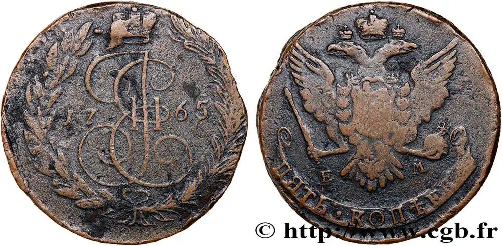Type : 5 KopecksDate : 1892Nom de l’atelier/ville : Saint-PetersbourgQuantité frappée : 8000000Métal : argentTitre en millième : 500 ‰Diamètre : 15 mmAxe des coins : 12 h.Poids : 0,84 g.Tranche : striéeRéférence ouvrage :KM.19/19a.1 – SEM.170.58 – WOL147.43 AversTitulature avers : (LÉGENDE CYRILLIQUE) АГ.Description avers : Aigle bicéphale héraldique couronné.ReversTitulature revers : (LÉGENDE CYRILLIQUE) * 5 * / КОПѢЕКЪ / 1892 / С.П.Б..Description revers : Légende cyrillique dans une couronne formée d’une branche d’olivier et d’une branche de chêne surmontée d’une petite couronne.Traduction revers : (5 Kopeks) 1892.HistoriqueRUSSIE
