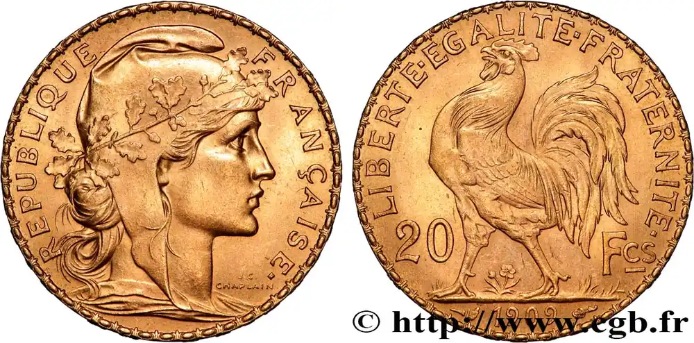 Type : 1 franc Chambres de CommerceDate : 1921Nom de l’atelier/ville : ParisQuantité frappée : 54571959Métal : bronze-aluminiumDiamètre : 23 mmAxe des coins : 6 h.Poids : 3,93 g.Tranche : canneléeRéférence ouvrage :Classement FRANC 2023 / FRANC 2023 classificationF.218/3AversTitulature avers : COMMERCE – INDUSTRIE.Description avers : Mercure assis à gauche, tenant un caducée ailé et appuyé sur un gouvernail ; une corne d’abondance à ses pieds ; sous un trait d’exergue le millésime et de part et d’autre DOMARD / INV..ReversTitulature revers : (ROSETTE) CHAMBRES. DE. COMMERCE. DE. FRANCE.Description revers : BON POUR / 1 / FRANC en trois lignes dans le champ, au-dessous Br. Al..HistoriqueTROISIÈME RÉPUBLIQUE(4/09/1870-10/07/1940) La nouvelle de la capitulation de Sedan provoque la révolution du 4 septembre 1870 à Paris. Proclamée à l’Hôtel de Ville, la République est dotée d’un gouvernement provisoire appelé gouvernement de la Défense nationale. Menacé à gauche par l’insurrection de la Commune et à droite par les monarchistes, le nouveau régime connaît des débuts difficiles. Chef du pouvoir exécutif dans un premier temps (février 1871), Thiers est chargé de réorganiser le pays avant de choisir sa forme de gouvernement. Il devient président de la République en août 1871 et, malgré son action de libération du territoire, doit quitter son poste en mars 1873 face à l’opposition royaliste. Il est alors remplacé par Mac-Mahon favorable au rétablissement de la monarchie mais celle-ci n’est pas restaurée à la suite de la question du drapeau. La loi du septennat est alors mise en place en novembre 1873 puis, en 1875, sont votées les lois fondamentales qui servent de Constitution à la Troisième République. Régime parlementaire, elle se caractérise notamment par la nette prépondérance du pouvoir législatif sur le pouvoir exécutif. Anticléricale, la Troisième République rend l’école gratuite, laïque et obligatoire mais continue la politique coloniale pour ses ambitions économiques, stratégiques et morales. La séparation des Églises et de l’État est votée en 1905. L’idée d’une revanche sur l’Allemagne et un nationalisme important sont au cœur de la crise boulangiste, du scandale de Panama ou de l’affaire Dreyfus des années 1886-1899 tandis que la politique étrangère est très active notamment au Maroc et que la course aux armements se développe. La Première Guerre mondiale coûte cher à la France qui ne se relève qu’à partir de 1920 voire 1928 pour la monnaie avec le franc « Poincaré ». La crise de 1929 ne se fait sentir qu’à partir de 1932 mais dure jusqu’en 1939, période durant laquelle l’instabilité ministérielle est très importante. Vacillant en 1934, la Troisième République trouve un nouveau ciment unitaire avec l’antifascisme qui permet l’arrivée au pouvoir du Front populaire en 1936. Mais, paralysée face à l’Allemagne, la France va alors s’enliser dans une « drôle de guerre » puis connaître l’une des plus grandes défaites de son histoire en juin 1940. Réunies en Assemblée nationale à Vichy le 10 juillet 1940, les Chambres, pourtant élues en 1936, votent les pleins pouvoirs à Pétain dans une sorte de suicide collectif par 569 voix pour, 80 voix contre et 18 abstentions.