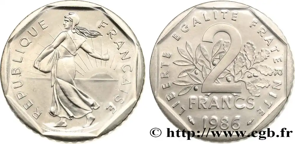 Type : 2 francs Semeuse, nickelDate : 1990Nom de l’atelier/ville : PessacQuantité frappée : 15011Métal : nickelDiamètre : 26,5 mmAxe des coins : 6 h.Poids : 7,50 g.Tranche : canneléeDegré de rareté : R1Commentaires sur l’état de conservation :Présence d’infimes traces de coups de sacRéférence ouvrage :Classement FRANC 2023 / FRANC 2023 classificationF.272/14AversTitulature avers : REPUBLIQUEFRANÇAISE..Description avers : La République à gauche, sous les traits d’une semeuse drapée et coiffée d’un bonnet phrygien, aux cheveux longs, marchant et semant à contre-vent ; en arrière-plan, derrière la semeuse à droite, un soleil levant ; au-dessous, D’APRÈS O. ROTY.ReversTitulature revers : LIBERTE EGALITE FRATERNITE..Description revers : 2 / FRANCS, brochant sur une branche d’olivier et une branche de chêne entrecroisées à leur base ; au-dessous 1990 encadré des différents.CommentaireExemplaire sous capsule provenant d’une série FDC.HistoriqueCINQUIÈME RÉPUBLIQUE(depuis le 08/01/1959) La Cinquième République, dont la constitution a été approuvée par référendum le 28 septembre 1958 par plus de 79 % des Français, ne débute officiellement qu’avec l’installation du général de Gaulle comme président le 8 janvier 1959. La constitution est modifiée le 28 octobre 1962 par référendum où une majorité de 62 % des voix approuve l’élection du président de la République au suffrage universel direct. Les différents présidents de la Ve République sont Charles de Gaulle (8/01/1959 – 27/04/1969, retrait et Alain Poher devient président par intérim), Georges Pompidou (15/06/1969 – 2/04/1974, décédé, Alain Poher devient président par intérim), Valéry Giscard d’Estaing (19/05/1974 – 21/05/1981), François Mitterrand (21/05/1981 – 7/05/1995), Jacques Chirac (7/05/1995 – 16/05/2007) , Nicolas Sarkozy (16/05/2007 – 15/05/2012), François Hollande (15/05/2012 – 14/05/2017) et Emmanuel Macron (14/05/2017 – ).