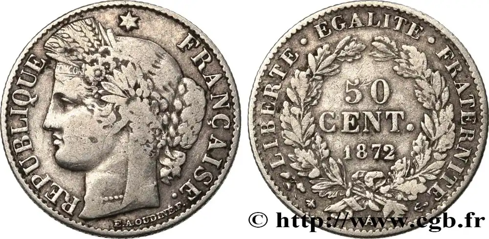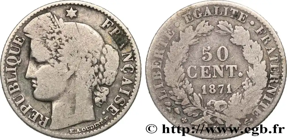 Type : 50 centimes Cérès, IIIe RépubliqueDate : 1882Nom de l’atelier/ville : ParisQuantité frappée : 2319719Métal : argentTitre en millième : 835 ‰Diamètre : 18 mmAxe des coins : 6 h.Poids : 2,50 g.Tranche : canneléeSlabPCGS : MS66Commentaires sur l’état de conservation :Sous coque PCGS MS66Référence ouvrage :Classement FRANC 2023 / FRANC 2023 classificationF.189/10AversTitulature avers : REPUBLIQUE – FRANÇAISE..Description avers : Tête de Cérès à gauche, surmontée d’une étoile, coiffée d’une couronne composite faite d’épis, de feuilles de chêne et d’olivier, avec un bandeau inscrit CONCOR ; signé E.A. OUDINÉ. F. au-dessous.ReversTitulature revers : (GLANDS) LIBERTE. EGALITE. FRATERNITE.// 50/ CENT./ 1882// A.Description revers : dans une couronne composite formée de deux branches entremêlées d’olivier et de chêne.HistoriqueTROISIÈME RÉPUBLIQUE(4/09/1870-10/07/1940) La nouvelle de la capitulation de Sedan provoque la révolution du 4 septembre 1870 à Paris. Proclamée à l’Hôtel de Ville, la République est dotée d’un gouvernement provisoire appelé gouvernement de la Défense nationale. Menacé à gauche par l’insurrection de la Commune et à droite par les monarchistes, le nouveau régime connaît des débuts difficiles. Chef du pouvoir exécutif dans un premier temps (février 1871), Thiers est chargé de réorganiser le pays avant de choisir sa forme de gouvernement. Il devient président de la République en août 1871 et, malgré son action de libération du territoire, doit quitter son poste en mars 1873 face à l’opposition royaliste. Il est alors remplacé par Mac-Mahon favorable au rétablissement de la monarchie mais celle-ci n’est pas restaurée à la suite de la question du drapeau. La loi du septennat est alors mise en place en novembre 1873 puis, en 1875, sont votées les lois fondamentales qui servent de Constitution à la Troisième République. Régime parlementaire, elle se caractérise notamment par la nette prépondérance du pouvoir législatif sur le pouvoir exécutif. Anticléricale, la Troisième République rend l’école gratuite, laïque et obligatoire mais continue la politique coloniale pour ses ambitions économiques, stratégiques et morales. La séparation des Églises et de l’État est votée en 1905. L’idée d’une revanche sur l’Allemagne et un nationalisme important sont au cœur de la crise boulangiste, du scandale de Panama ou de l’affaire Dreyfus des années 1886-1899 tandis que la politique étrangère est très active notamment au Maroc et que la course aux armements se développe. La Première Guerre mondiale coûte cher à la France qui ne se relève qu’à partir de 1920 voire 1928 pour la monnaie avec le franc « Poincaré ». La crise de 1929 ne se fait sentir qu’à partir de 1932 mais dure jusqu’en 1939, période durant laquelle l’instabilité ministérielle est très importante. Vacillant en 1934, la Troisième République trouve un nouveau ciment unitaire avec l’antifascisme qui permet l’arrivée au pouvoir du Front populaire en 1936. Mais, paralysée face à l’Allemagne, la France va alors s’enliser dans une « drôle de guerre » puis connaître l’une des plus grandes défaites de son histoire en juin 1940. Réunies en Assemblée nationale à Vichy le 10 juillet 1940, les Chambres, pourtant élues en 1936, votent les pleins pouvoirs à Pétain dans une sorte de suicide collectif par 569 voix pour, 80 voix contre et 18 abstentions.