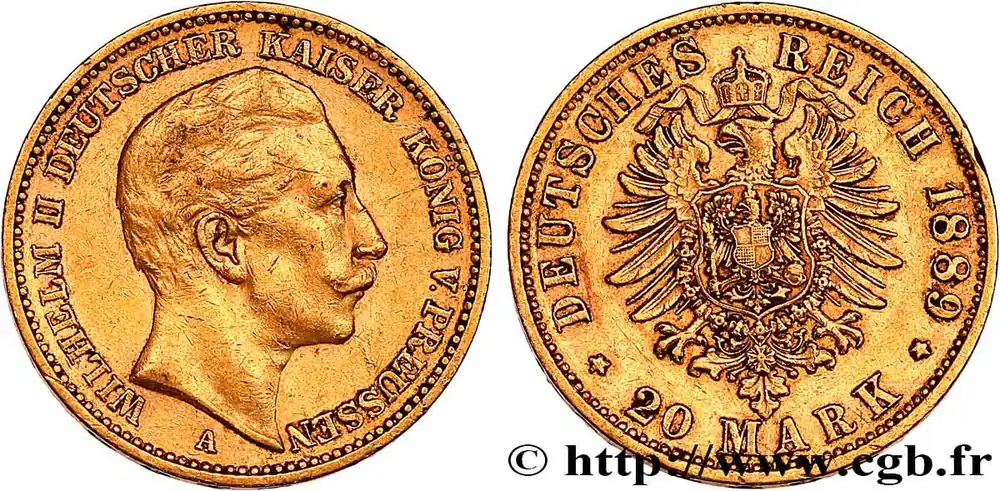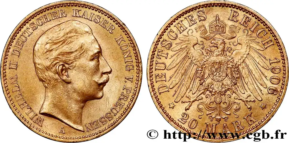 Type : 20 Mark Guillaume IIDate : 1913Nom de l’atelier/ville : BerlinQuantité frappée : 6101730Métal : orTitre en millième : 900 ‰Diamètre : 22,5 mmAxe des coins : 12 h.Poids : 7,94 g.Tranche : inscrite en creux GOTT MIT UNSRéférence ouvrage :AKS.125 AversTitulature avers : WILHELM II DEUTSCHER KAISER KÖNIG V. PREUSSEN.Description avers : Tête nue de Guillaume Ier à droite ; au-dessous, A.Traduction avers : (Guillaume II empereur Allemand, roi de Prusse).ReversTitulature revers : DEUTSCHES – REICH/ *20 MARK/ 1913*.Description revers : Aiglé héraldique couronné, timbré d’un écu aux armes de la Prusse.HistoriqueOR, PALLADIUM ET PLATINE INVESTISSEMENTSécurisez et diversifiez votre épargne avec les métaux précieux :Dans un contexte d’instabilité politique et économique croissante, diversifier son épargne peut être une démarche judicieuse. Les métaux précieux comme l’or, le palladium et le platine constituent des actifs tangibles souvent prisés en raison de leur caractère intemporel et de leur résilience face aux fluctuations des marchés.Pour répondre à des besoins variés, l’achat de pièces officielles en or, palladium ou platine est une option flexible et adaptée. Ces pièces, disponibles à l’unité ou en lot, permettent à chacun d’ajuster ses choix selon ses objectifs et son budget, sans engagement à long terme.Un processus simple et sécurisé :Nous proposons une livraison sécurisée et garantie. Les paiements peuvent être effectués par carte bancaire ou par virement, bien que certaines transactions puissent nécessiter un règlement exclusivement par virement bancaire. Une pièce d’identité valide (carte nationale d’identité ou passeport) sera demandée pour finaliser votre achat.Stockage en toute sécurité et confidentialité :Le département Investissement de CGB Numismatique Paris met à votre disposition des solutions de stockage offrant une sécurité renforcée et une confidentialité optimale pour vos achats en or, palladium et platine.Contactez-nous pour plus d’informations :Pour toute question ou pour passer commande, prenez contact avec notre responsable des achats/ventes de métaux précieux : par email à [email protected] ou par téléphone. Nous mettons à votre disposition des informations générales et des services pour vous accompagner dans vos projets d’investissement.CGB Numismatique Paris agit en tant que fournisseur de métaux précieux et ne fournit aucun conseil en investissement. La valeur des métaux précieux peut fluctuer, et les performances passées ne garantissent pas les résultats futurs. L’achat de métaux précieux doit être considéré comme une stratégie de préservation de valeur plutôt qu’un investissement spéculatif. Conformément à l’article L.221-28 du Code de la consommation, le droit de rétractation ne s’applique pas aux achats d’or d’investissement, dont le prix dépend des fluctuations des marchés financiers.