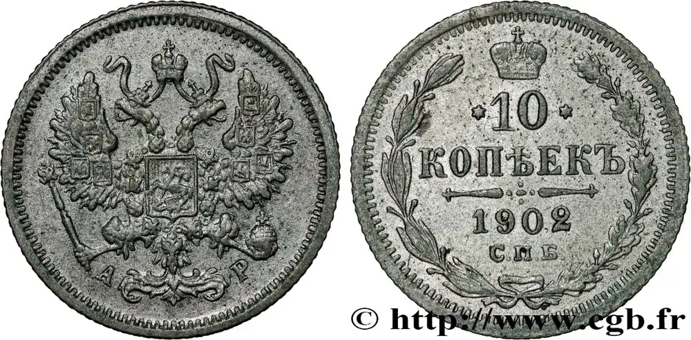 Type : 10 Kopecks aigle bicéphaleDate : 1907Nom de l’atelier/ville : Saint-PetersbourgQuantité frappée : 20000000Métal : argentTitre en millième : 500 ‰Diamètre : 17,2 mmAxe des coins : 12 h.Poids : 1,67 g.Tranche : striéeRéférence ouvrage :KM20/20a.2 AversTitulature avers : (LÉGENDE EN CYRILLIQUE) ЭБ.Description avers : Aigle bicéphale héraldique couronné.ReversTitulature revers : (LÉGENDE EN CYRILLIQUE) *10* / КОПѢЕКЪ / 1907 / СПБ.Description revers : Légende cyrillique dans une couronne formée d’une branche d’olivier et d’une branche de chêne surmontée d’une petite couronne.HistoriqueRUSSIE