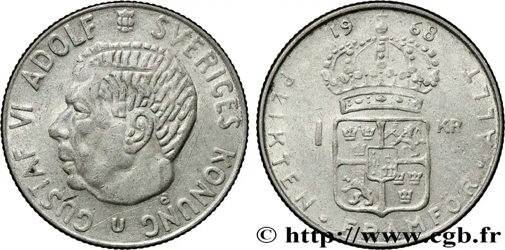 Type : 1 Krona Gustave VIDate : 1963Quantité frappée : 14227500Métal : argentTitre en millième : 400 ‰Diamètre : 25 mmAxe des coins : 12 h.Poids : 7 g.Tranche : canneléeRéférence ouvrage :KM20/826 AversTitulature avers : GUSTAF VI ADOLF SVERIGES KONUNG // U // Õ.Description avers : Tête à gauche de Gustave VI de Suède.Traduction avers : (Gustave VI Adolphe roi de Suède).ReversTitulature revers : 19 – 63 // 1 – KR // PLIKTEN·FRAMFÖR·ALLT.Description revers : Écu couronné au centre.Traduction revers : (Le devoir avant tout).HistoriqueSUÈDE