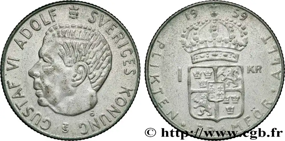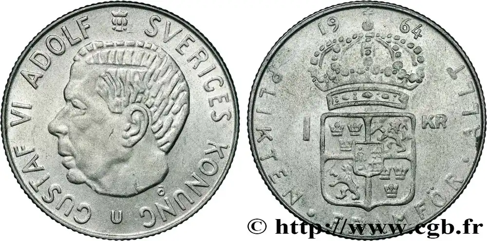 Type : 1 Krona Gustave VIDate : 1967Quantité frappée : 17234500Métal : argentTitre en millième : 400 ‰Diamètre : 25 mmAxe des coins : 12 h.Poids : 7 g.Tranche : canneléeRéférence ouvrage :KM20/826 AversTitulature avers : GUSTAF VI ADOLF SVERIGES KONUNG // U // Õ.Description avers : Tête à gauche de Gustave VI de Suède.Traduction avers : (Gustave VI Adolphe roi de Suède).ReversTitulature revers : 19 – 67 // 1 – KR // PLIKTEN·FRAMFÖR·ALLT.Description revers : Écu couronné au centre.Traduction revers : (Le devoir avant tout).HistoriqueSUÈDE