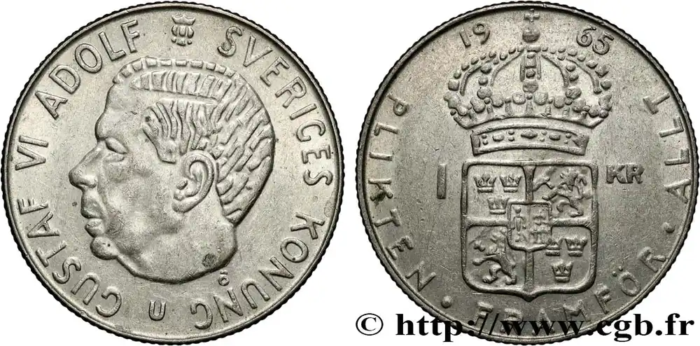 Type : 1 Krona Gustave VIDate : 1967Quantité frappée : 17234500Métal : argentTitre en millième : 400 ‰Diamètre : 25 mmAxe des coins : 12 h.Poids : 7 g.Tranche : canneléeRéférence ouvrage :KM20/826 AversTitulature avers : GUSTAF VI ADOLF SVERIGES KONUNG // U // Õ.Description avers : Tête à gauche de Gustave VI de Suède.Traduction avers : (Gustave VI Adolphe roi de Suède).ReversTitulature revers : 19 – 67 // 1 – KR // PLIKTEN·FRAMFÖR·ALLT.Description revers : Écu couronné au centre.Traduction revers : (Le devoir avant tout).HistoriqueSUÈDE