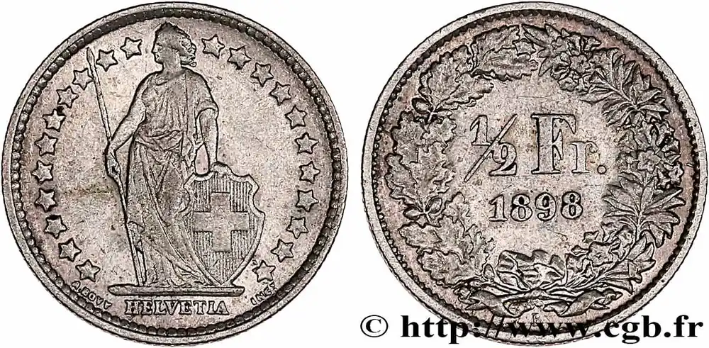 Type : 1/2 Franc HelvetiaDate : 1967Nom de l’atelier/ville : BerneQuantité frappée : 16096000Métal : argentTitre en millième : 835 ‰Diamètre : 18 mmAxe des coins : 6 h.Poids : 2,47 g.Tranche : canneléeRéférence ouvrage :KM20/23 AversTitulature avers : HELVETIA.Description avers : Helvetia debout tenant une lance et un bouclier à la croix posé à ses pieds, dans une couronne d’étoile.ReversTitulature revers : 1/2 FR. ET (DATE).Description revers : dans une couronne composite, de feuilles de chênes à gauche et de fleurs variées à droite.HistoriqueSUISSE