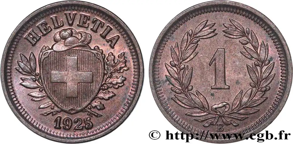 Type : 1 Centime (Rappen) Croix SuisseDate : 1925Nom de l’atelier/ville : BerneQuantité frappée : 2500000Métal : bronzeDiamètre : 16 mmAxe des coins : 12 h.Poids : 1,51 g.Tranche : lisseCommentaires sur l’état de conservation :De petites taches de part et d’autreRéférence ouvrage :KM20/3.2 – HMZ.2-1215ddd AversTitulature avers : HELVETIA // 1925.Description avers : écu à la croix entre deux rameaux surmonté d’un chapeau.ReversTitulature revers : 1 / B.Description revers : dans le champ entre deux rameaux de laurier.HistoriqueSUISSE