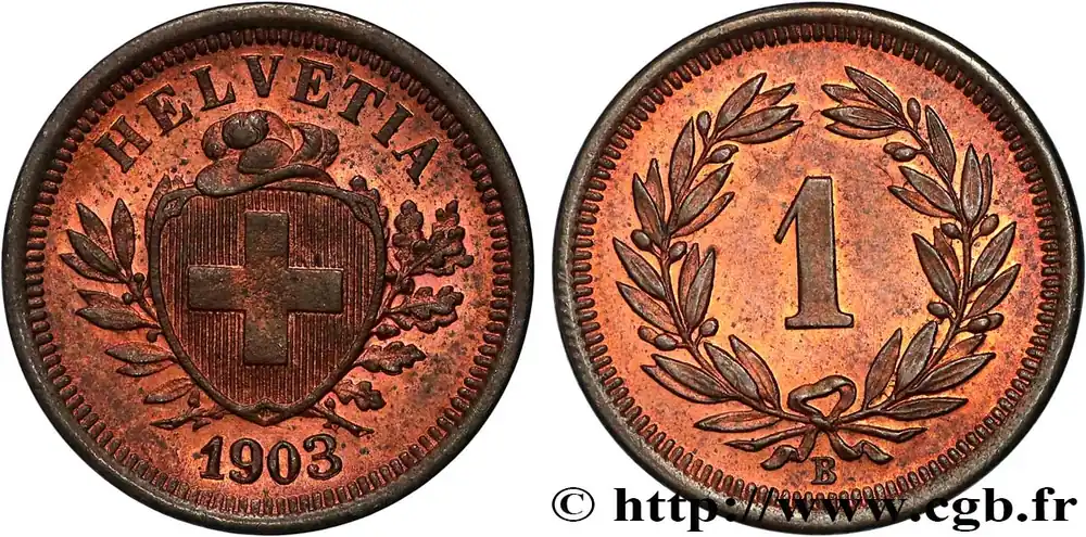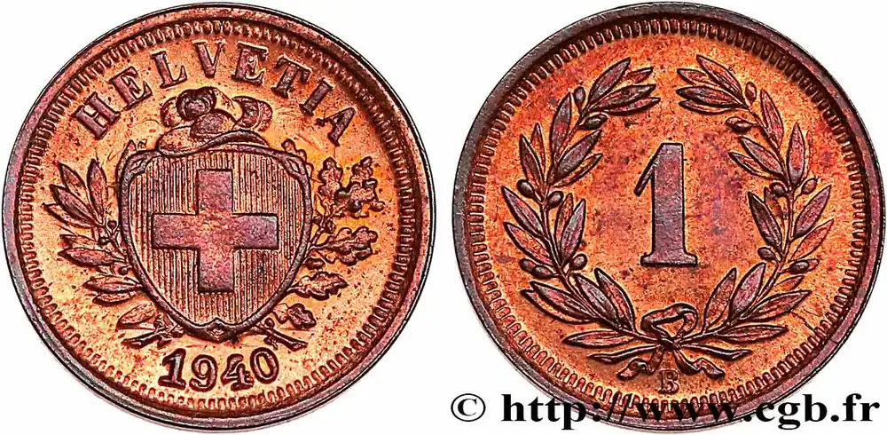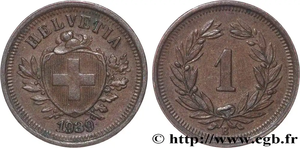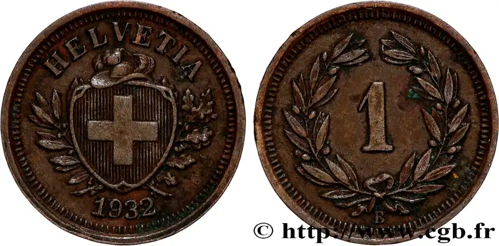 Type : 1 Centime (Rappen) Croix SuisseDate : 1931Nom de l’atelier/ville : BerneQuantité frappée : 5000000Métal : bronzeDiamètre : 16 mmAxe des coins : 12 h.Poids : 1,49 g.Tranche : lisseRéférence ouvrage :KM20/3.2  – HMZ.2-1215jjj AversTitulature avers : HELVETIA // 1931.Description avers : écu à la croix entre deux rameaux surmonté d’un chapeau.ReversTitulature revers : 1 / B.Description revers : dans le champ entre deux rameaux de laurier.HistoriqueSUISSE