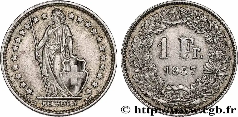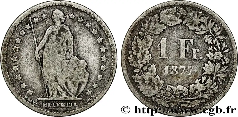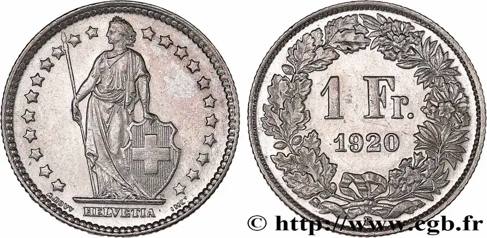 Type : 1 Franc HelvetiaDate : 1920Nom de l’atelier/ville : BerneQuantité frappée : 3300000Métal : argentTitre en millième : 835 ‰Diamètre : 23 mmAxe des coins : 6 h.Poids : 4,95 g.Tranche : canneléeCommentaires sur l’état de conservation :Traces de nettoyageRéférence ouvrage :KM20/24 AversTitulature avers : HELVETIA.Description avers : Helvetia debout tenant une lance et un bouclier à la croix posé à ses pieds, dans une couronne d’étoile.ReversTitulature revers : 1 FR. ET (DATE).Description revers : dans une couronne composite, de feuilles de chênes à gauche et de fleurs variées à droite.HistoriqueSUISSE