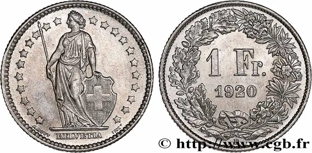 Type : 1 Franc HelvetiaDate : 1921Nom de l’atelier/ville : BerneQuantité frappée : 3800000Métal : argentTitre en millième : 835 ‰Diamètre : 23 mmAxe des coins : 6 h.Poids : 4,98 g.Tranche : striéeCommentaires sur l’état de conservation :monnaie nettoyéeRéférence ouvrage :HMZ.2-1204aa – KM20/24 AversTitulature avers : HELVETIA.Description avers : Helvetia debout tenant une lance et un bouclier.ReversTitulature revers : 1 FR. / 1921.Description revers : dans une couronne composite inscription 1 Fr. et date.HistoriqueSUISSE