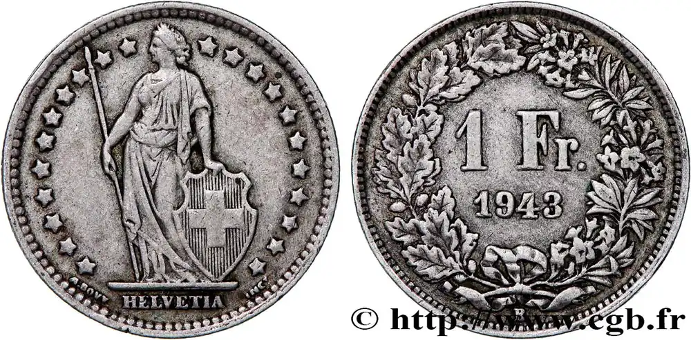 Type : 1 Franc HelvetiaDate : 1921Nom de l’atelier/ville : BerneQuantité frappée : 3800000Métal : argentTitre en millième : 835 ‰Diamètre : 23 mmAxe des coins : 6 h.Poids : 4,98 g.Tranche : striéeCommentaires sur l’état de conservation :monnaie nettoyéeRéférence ouvrage :HMZ.2-1204aa – KM20/24 AversTitulature avers : HELVETIA.Description avers : Helvetia debout tenant une lance et un bouclier.ReversTitulature revers : 1 FR. / 1921.Description revers : dans une couronne composite inscription 1 Fr. et date.HistoriqueSUISSE
