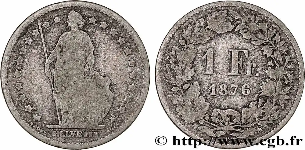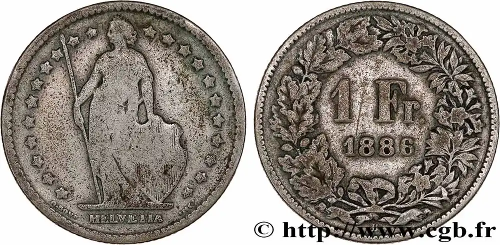 Type : 1 Franc HelvetiaDate : 1963Nom de l’atelier/ville : BerneQuantité frappée : 13476000Métal : argentTitre en millième : 835 ‰Diamètre : 23 mmAxe des coins : 6 h.Poids : 5 g.Tranche : canneléeRéférence ouvrage :KM20/24 AversTitulature avers : HELVETIA.Description avers : Helvetia debout tenant une lance et un bouclier à la croix posé à ses pieds, dans une couronne d’étoile.ReversTitulature revers : 1 FR. ET (DATE).Description revers : dans une couronne composite, de feuilles de chênes à gauche et de fleurs variées à droite.HistoriqueSUISSE