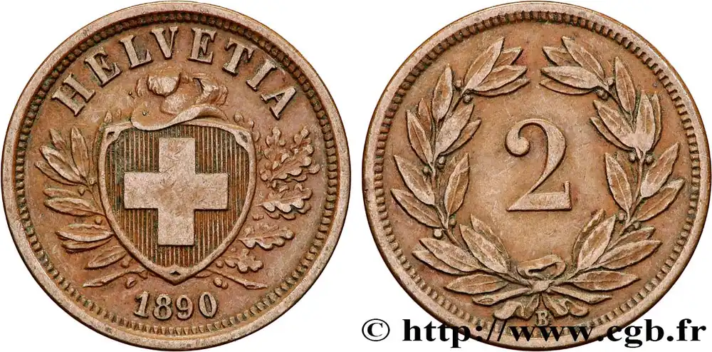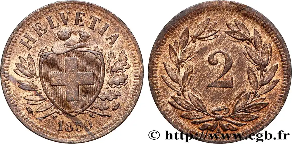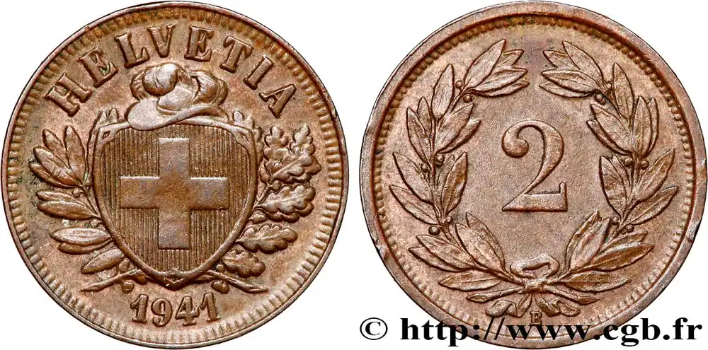 Type : 2 Centimes (Rappen) croix suisseDate : 1931Nom de l’atelier/ville : Berne – BQuantité frappée : 1288300Métal : bronzeDiamètre : 20 mmAxe des coins : 12 h.Poids : 2,58 g.Tranche : lisseRéférence ouvrage :KM20/4.1 AversTitulature avers : HELVETIA // 1931.Description avers : écu surmonté d’un chapeau entre un rameau d’olivier un rameau de chêne.ReversTitulature revers : 2 // B.Description revers : couronne de laurier.HistoriqueSUISSE