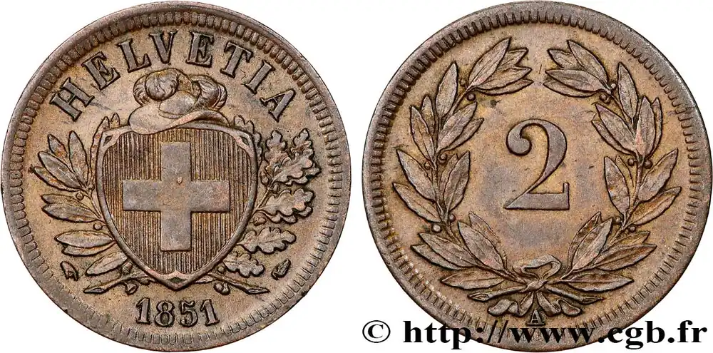 Type : 2 Centimes (Rappen) croix suisseDate : 1941Nom de l’atelier/ville : Berne – BQuantité frappée : 3448000Métal : bronzeDiamètre : 20 mmAxe des coins : 12 h.Tranche : lisseRéférence ouvrage :KM20/4.1  – HMZ.2-1213ss AversTitulature avers : HELVETIA // 1941.Description avers : écu à la croix entre deux rameaux surmonté d’un chapeau.ReversTitulature revers : 2 // B.Description revers : au centre d’une couronne de laurier.HistoriqueSUISSE