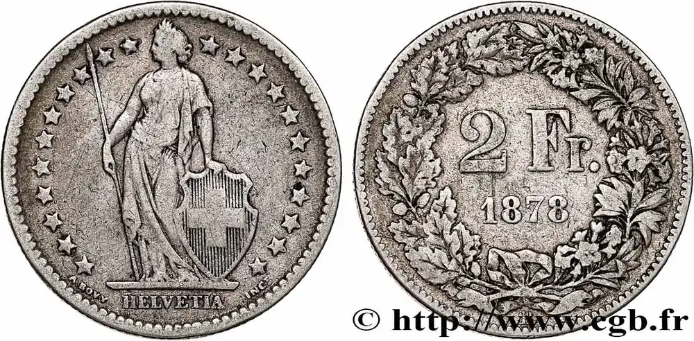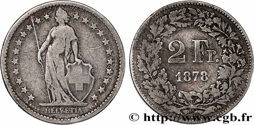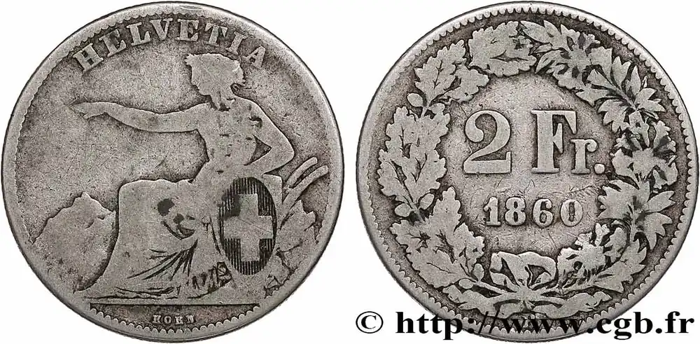 Type : 2 Francs HelvetiaDate : 1963Nom de l’atelier/ville : BerneQuantité frappée : 8030000Métal : argentTitre en millième : 835 ‰Diamètre : 27,2 mmAxe des coins : 6 h.Poids : 10,01 g.Tranche : canneléeRéférence ouvrage :HMZ.2-1202tt – KM20/21 AversTitulature avers : HELVETIA.Description avers : Helvetia debout tenant une lance et un bouclier, étoiles.ReversDescription revers : Dans une couronne composite, inscriptions 2 Fr. et date.HistoriqueSUISSE