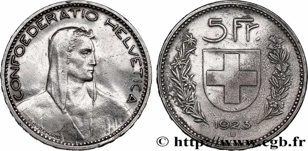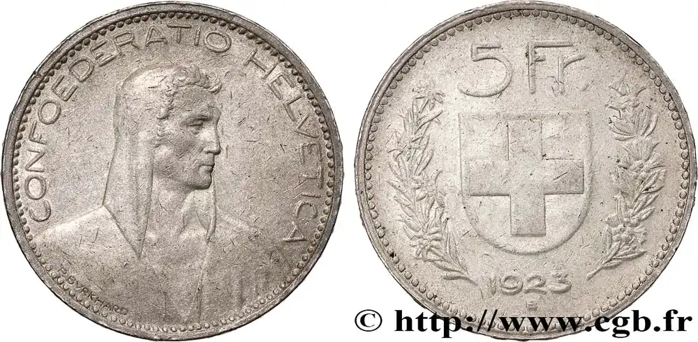 Type : 5 Francs BergerDate : 1923Nom de l’atelier/ville : BerneQuantité frappée : 11300000Métal : argentTitre en millième : 900 ‰Diamètre : 37 mmAxe des coins : 6 h.Poids : 25,04 g.Tranche : tranche en reliefCommentaires sur l’état de conservation :Patine tachéeRéférence ouvrage :KM20/37 – HMZ.1199 AversTitulature avers : CONFOEDERATIO HELVETICA.Description avers : Buste drapé à droite.Traduction avers : (Confédération helvétique).ReversTitulature revers : 5 FR./ 1923/ B.Description revers : Écu dans une couronne.HistoriqueSUISSE